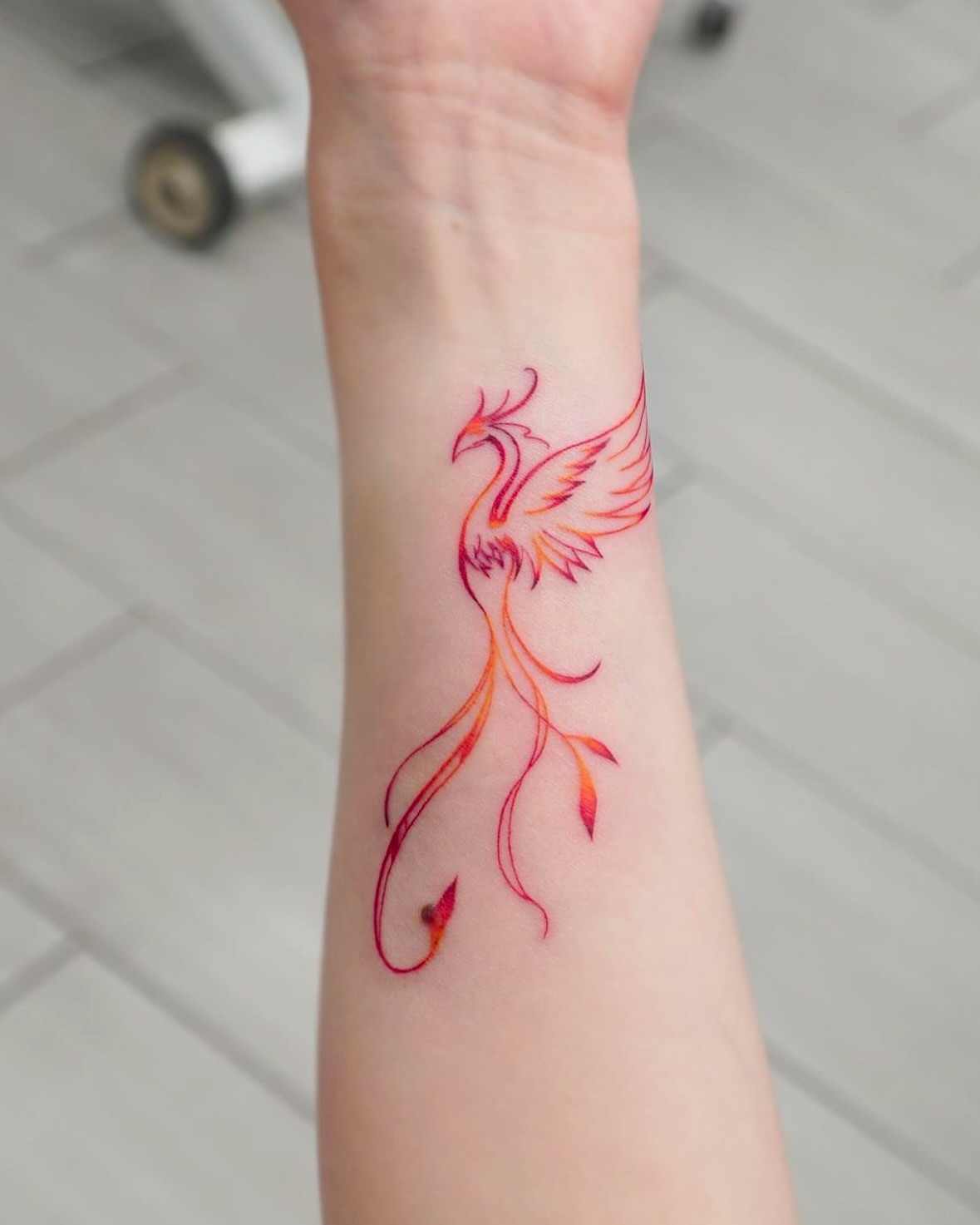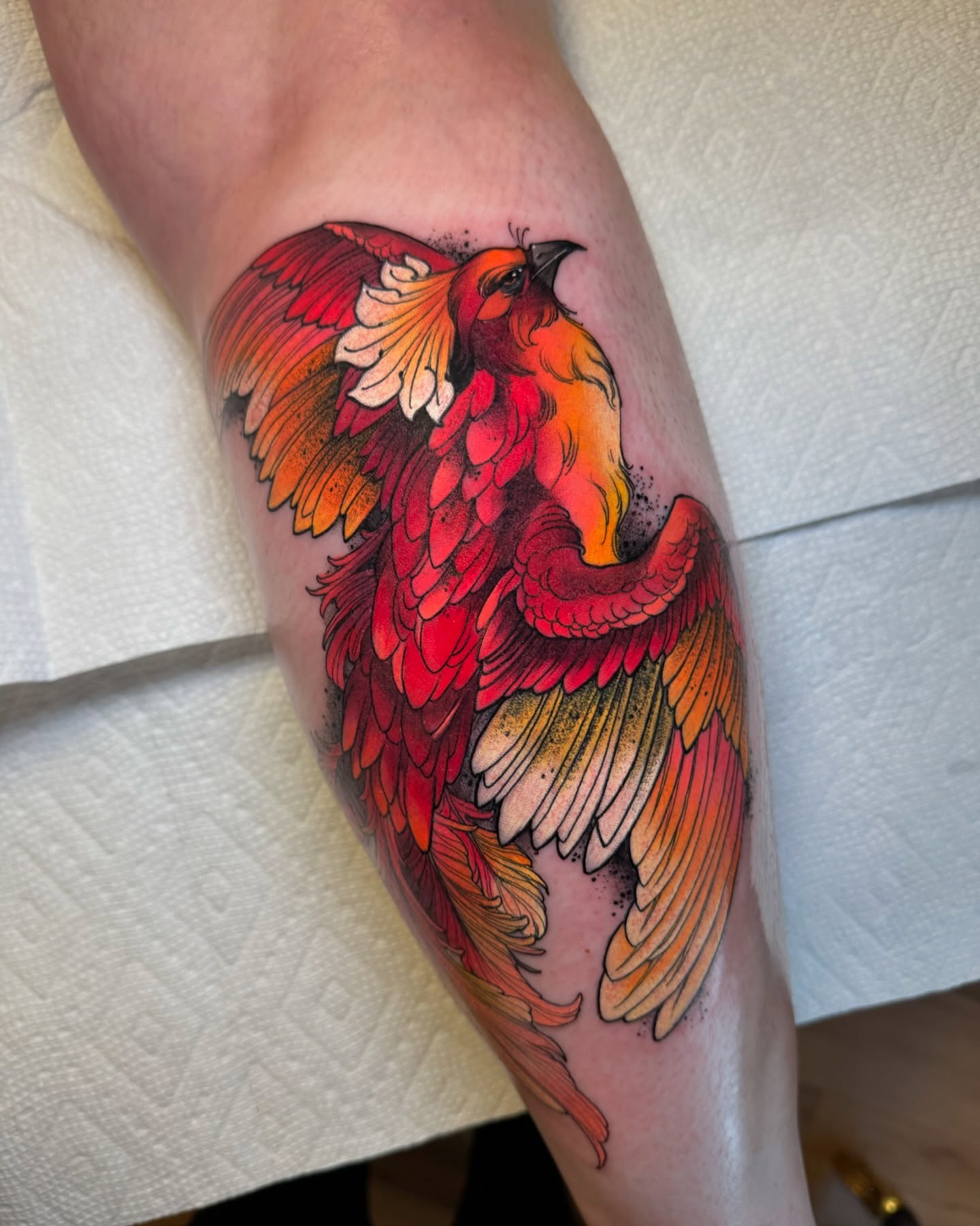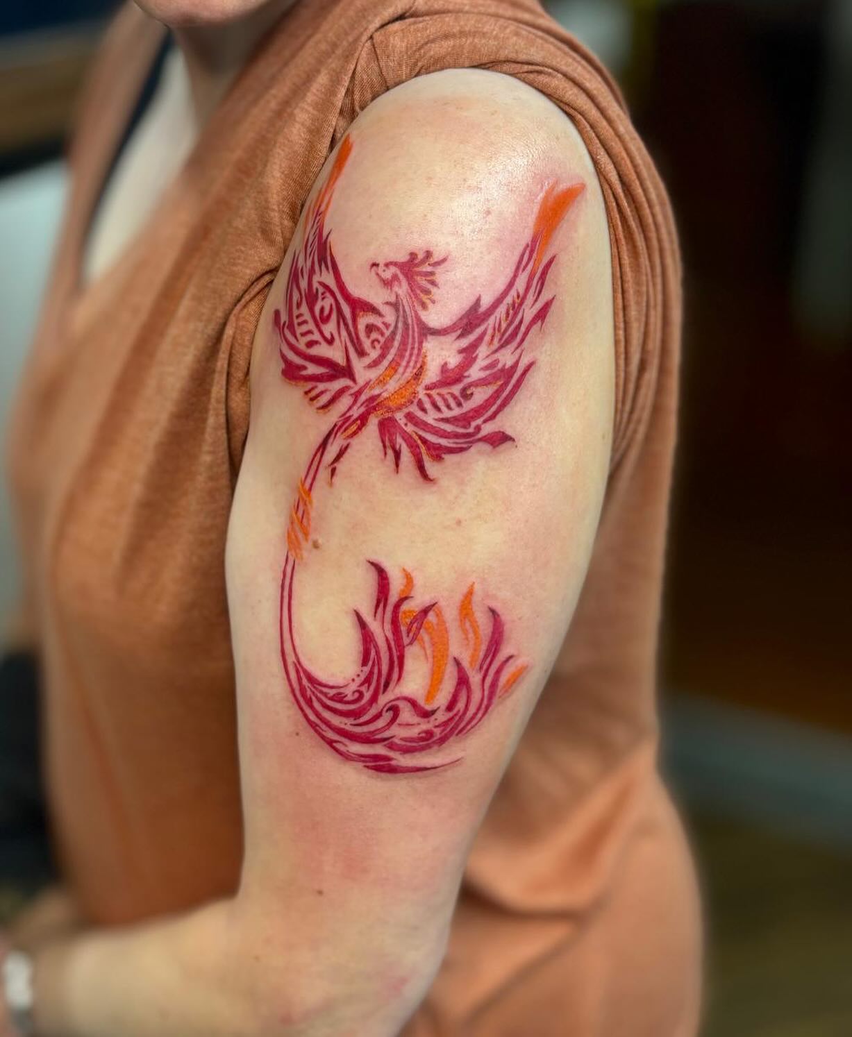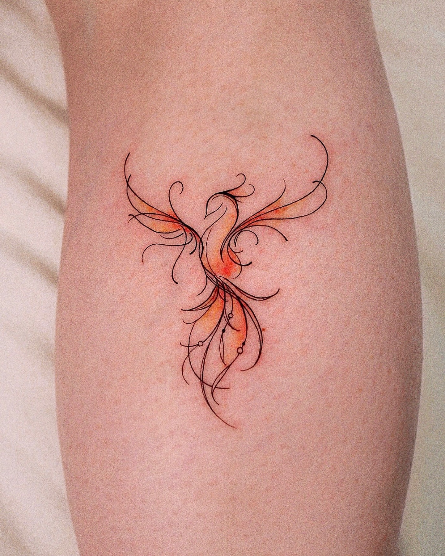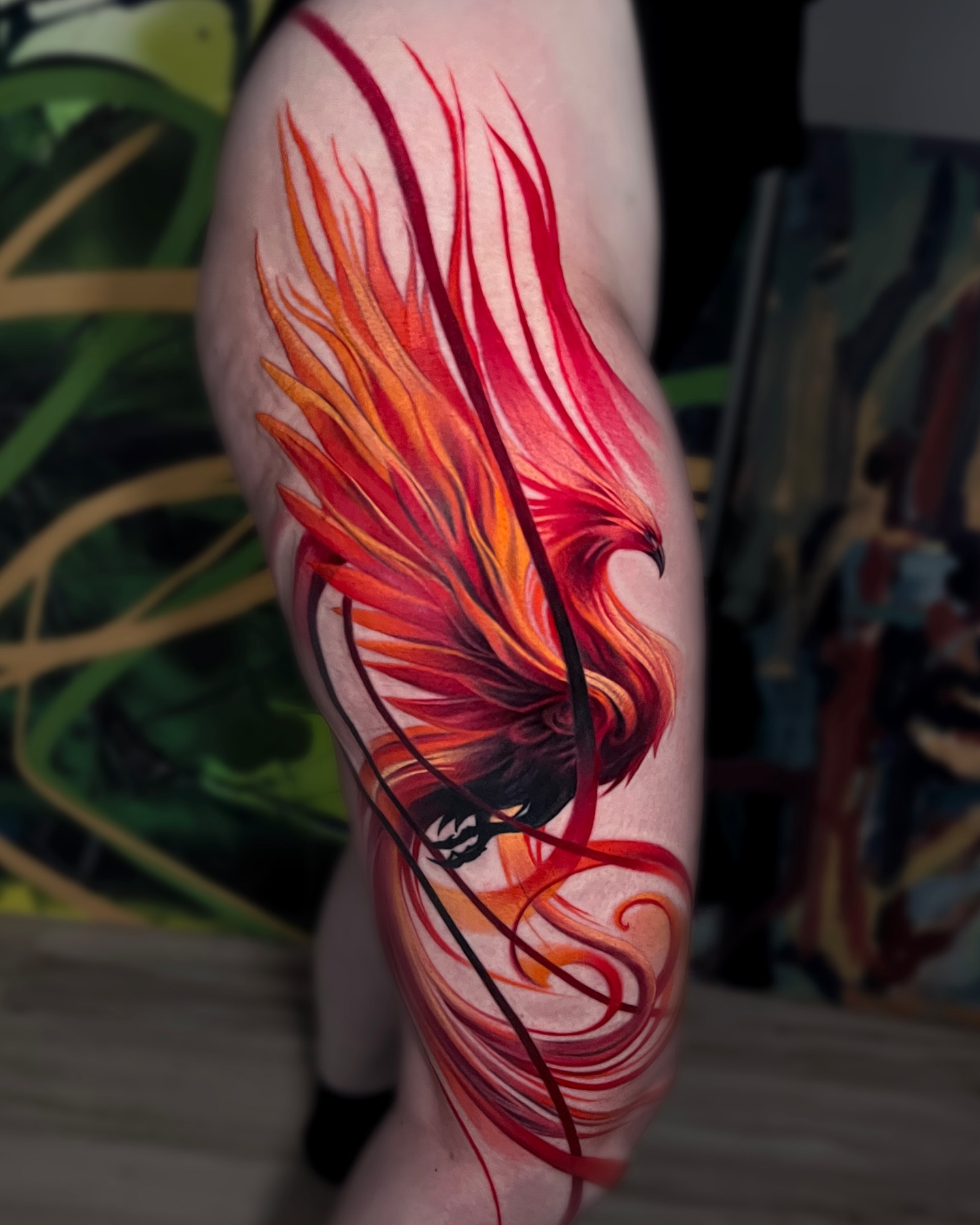 This vibrant phoenix tattoo bursts with life and energy, showcasing a beautiful blend of fiery reds and oranges. The intricate details and graceful lines symbolize rebirth and strength, making it a perfect choice for women who embrace their unique journeys. When considering a phoenix tattoo, think about how its meaning resonates with your personal story and style.