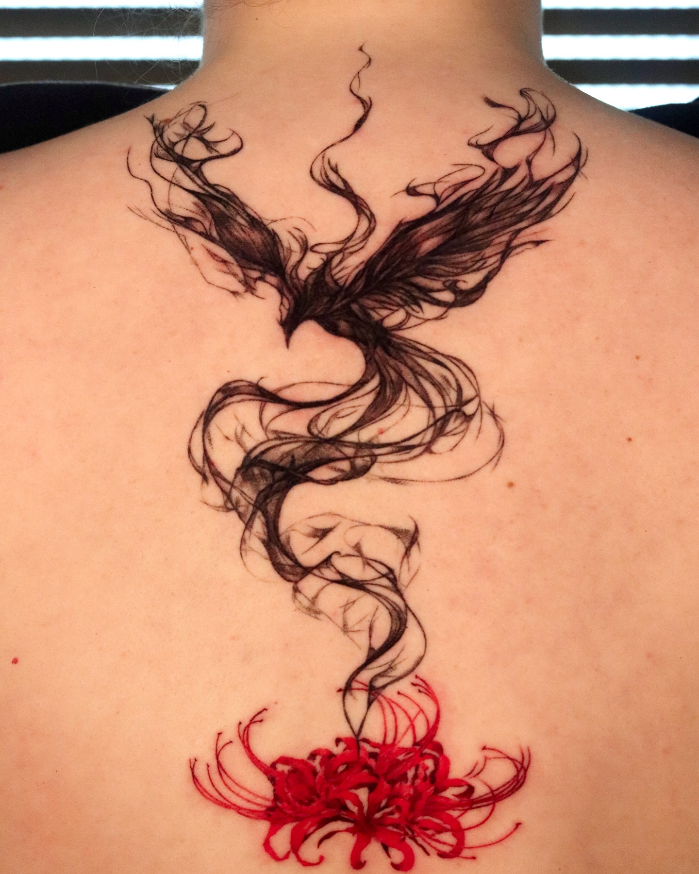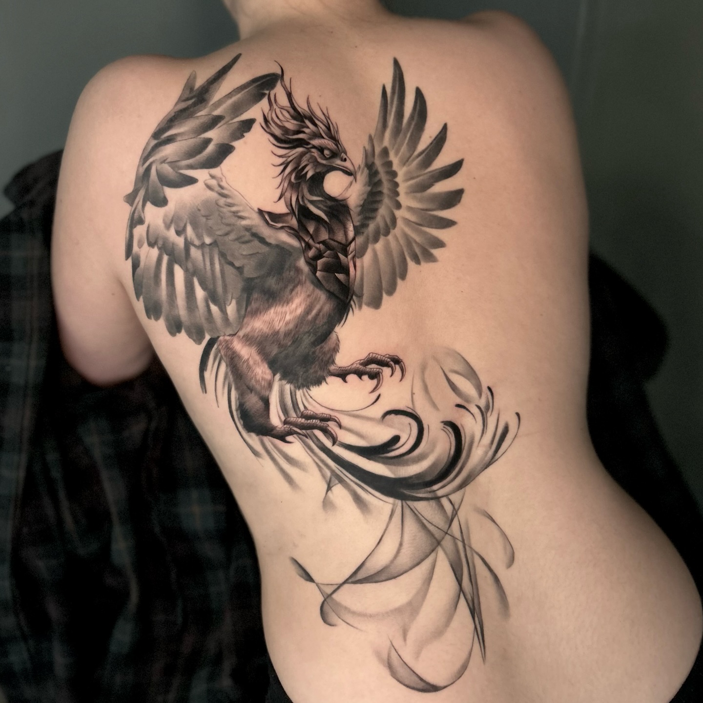 This stunning tattoo captures the beauty of a phoenix in flight, showcasing intricate details and elegant lines. The design flows gracefully across the back, symbolizing rebirth and empowerment. For those considering a phoenix tattoo, choosing a design that resonates personally can make it even more meaningful.
