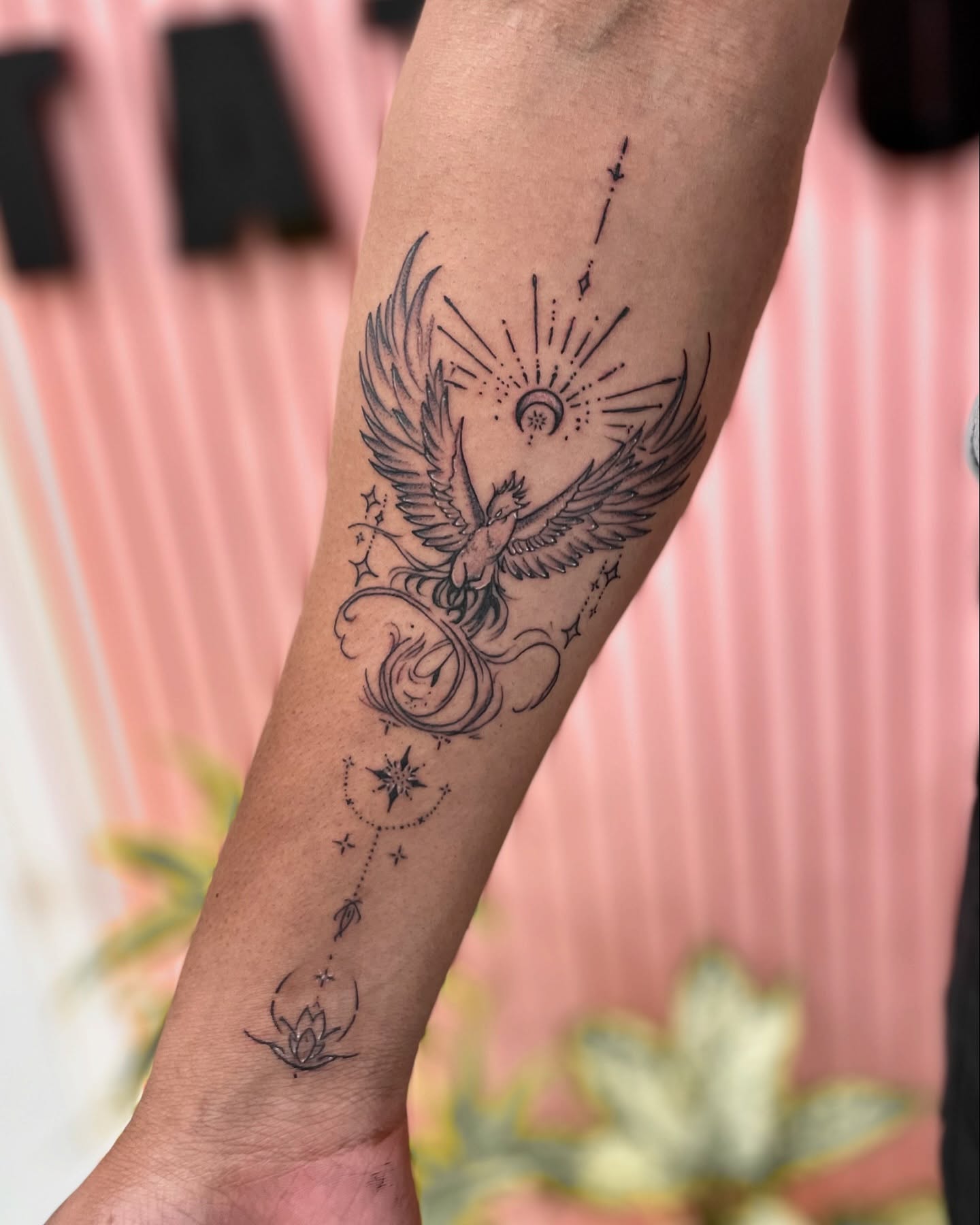 This stunning tattoo showcases a beautifully designed phoenix with its wings spread wide, symbolizing strength and rebirth. The intricate details and flowing lines create a sense of movement, making it truly eye-catching. For women considering a phoenix tattoo, choosing a design that reflects personal meaning can make it even more special.
