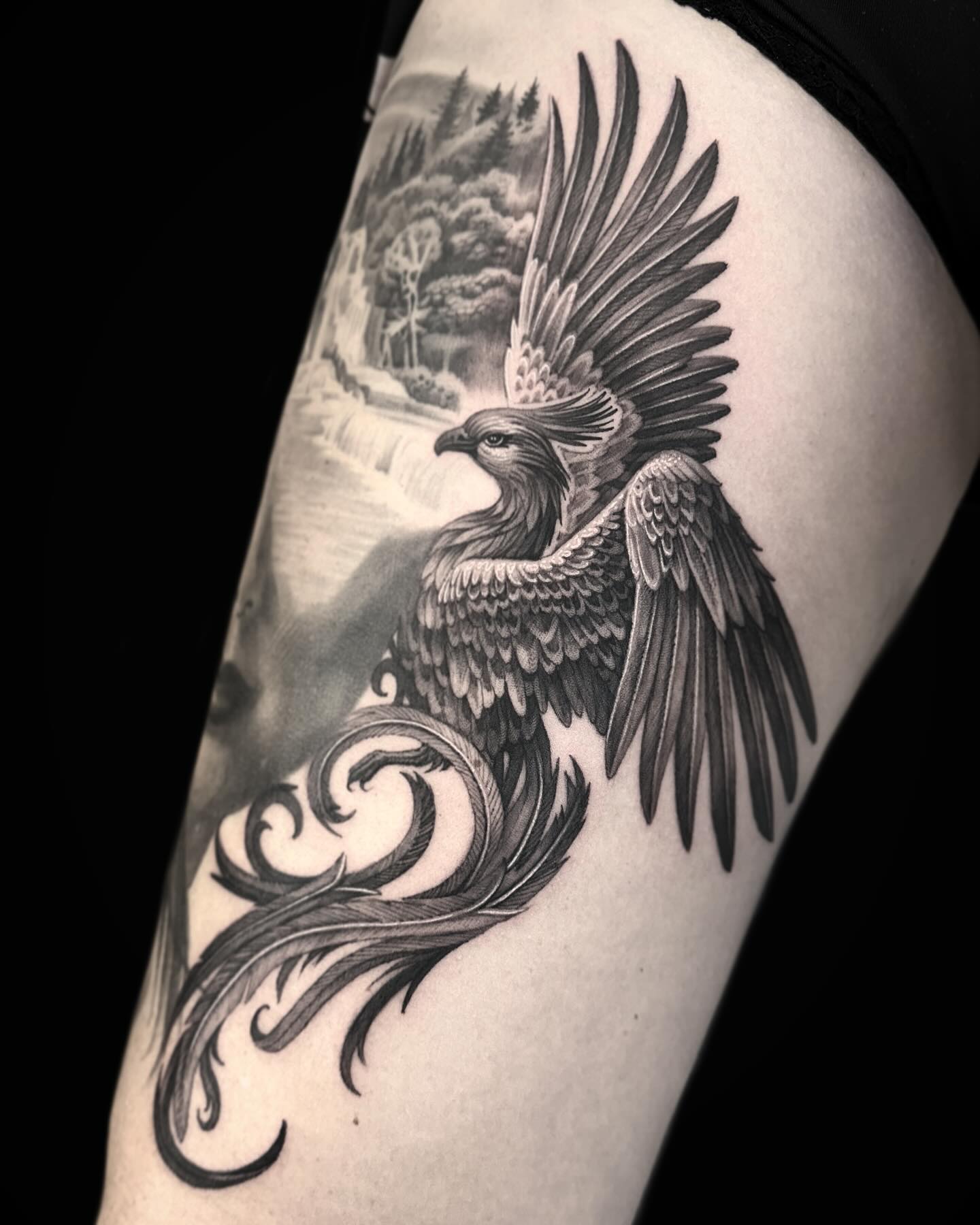 This stunning tattoo beautifully captures the grace of a phoenix soaring through the air, its wings outstretched and feathers detailed with care. The intricate design not only symbolizes rebirth and strength but also showcases the artistry that goes into creating such a meaningful piece. For those considering a phoenix tattoo, choosing a unique style can make the design even more personal and special.