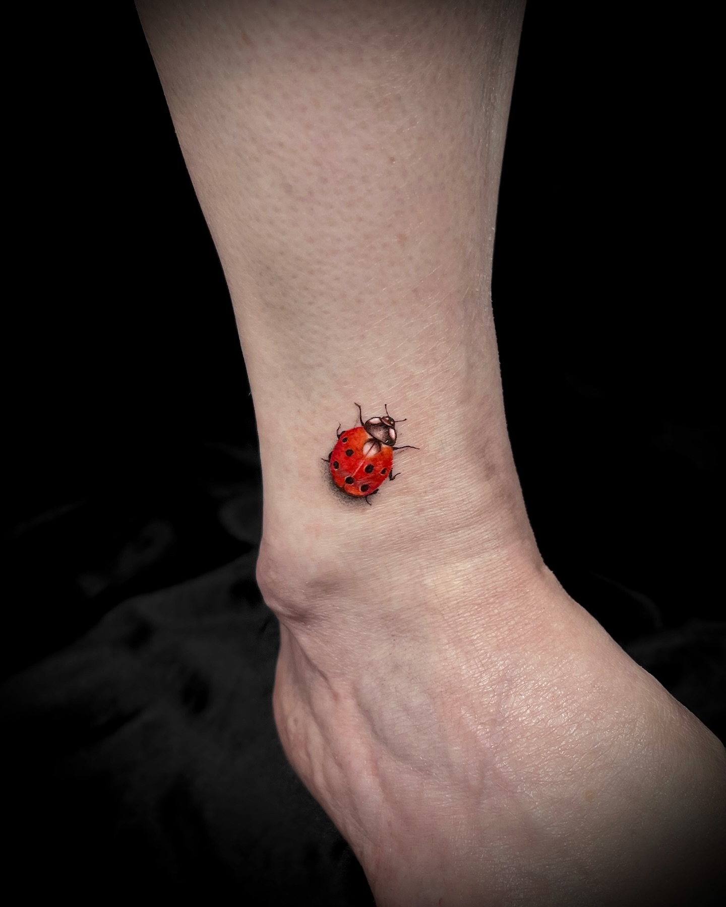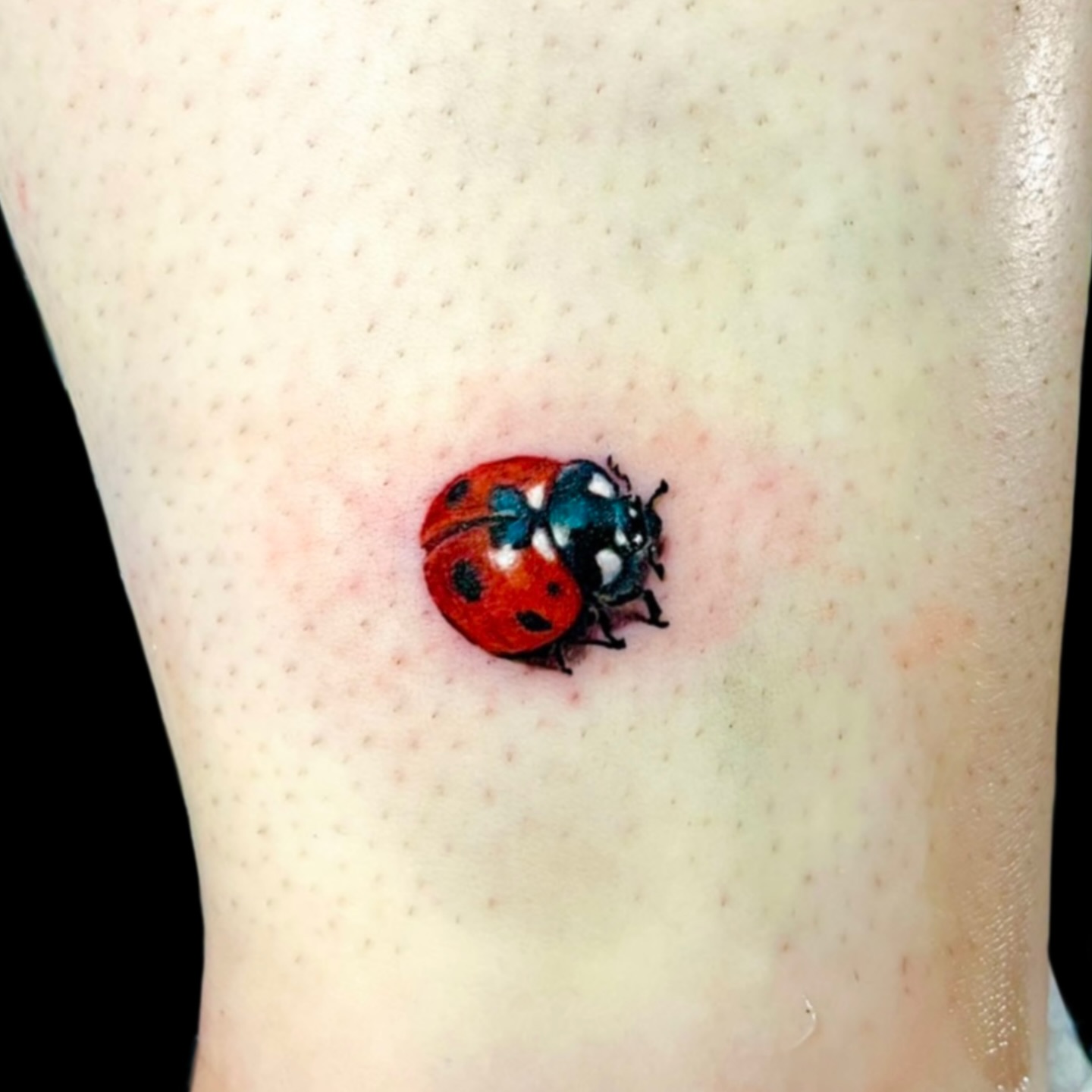 The fine detailing of the ladybug’s spots and its delicate legs showcases skilled tattoo artistry, creating a lifelike appearance despite its tiny size.
