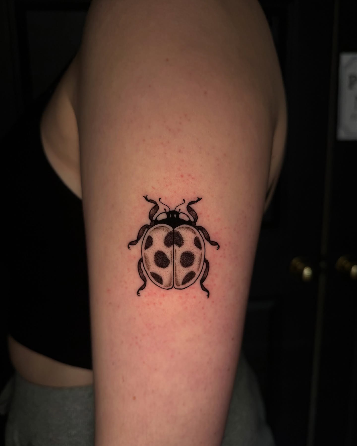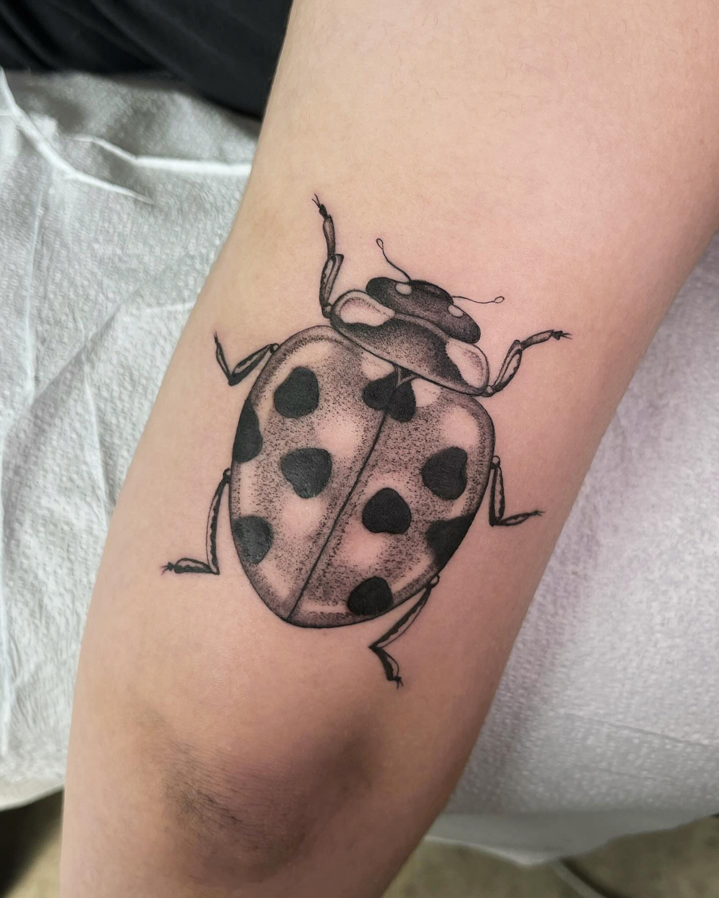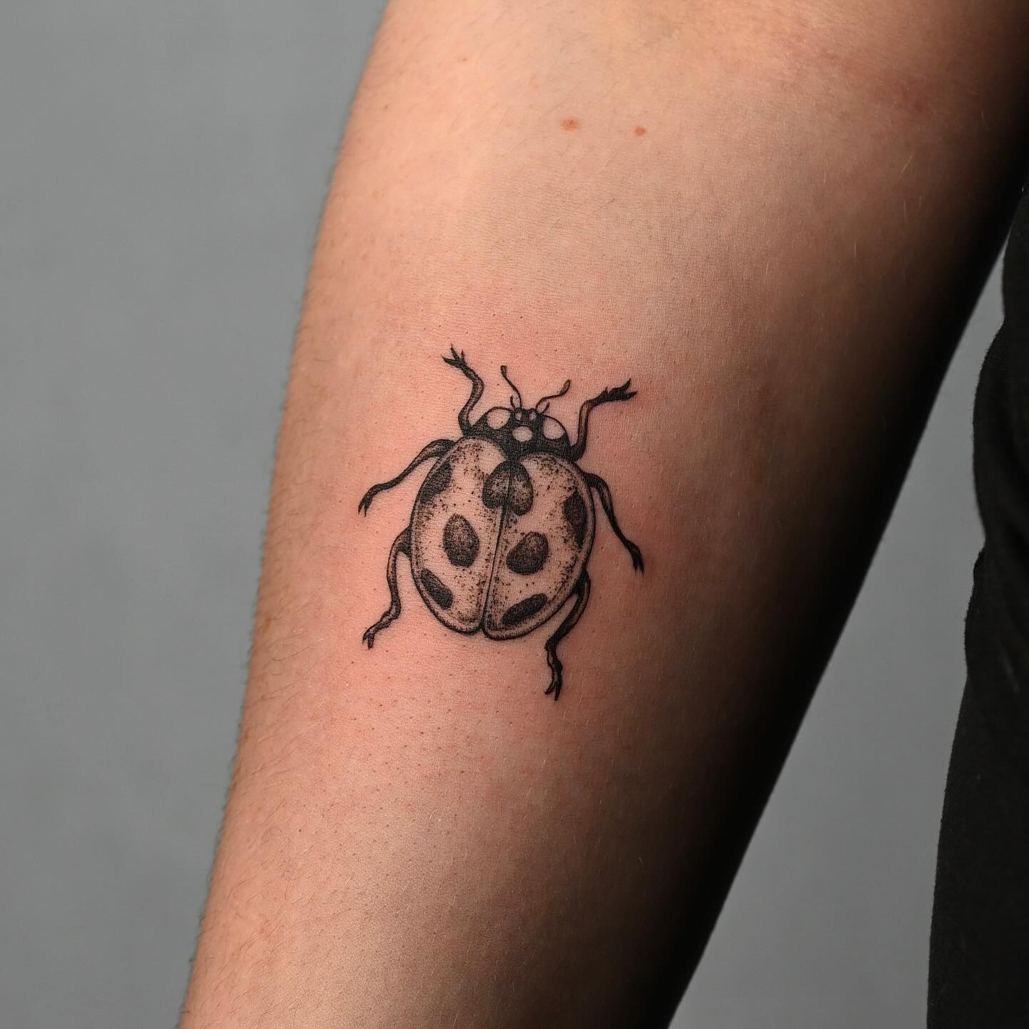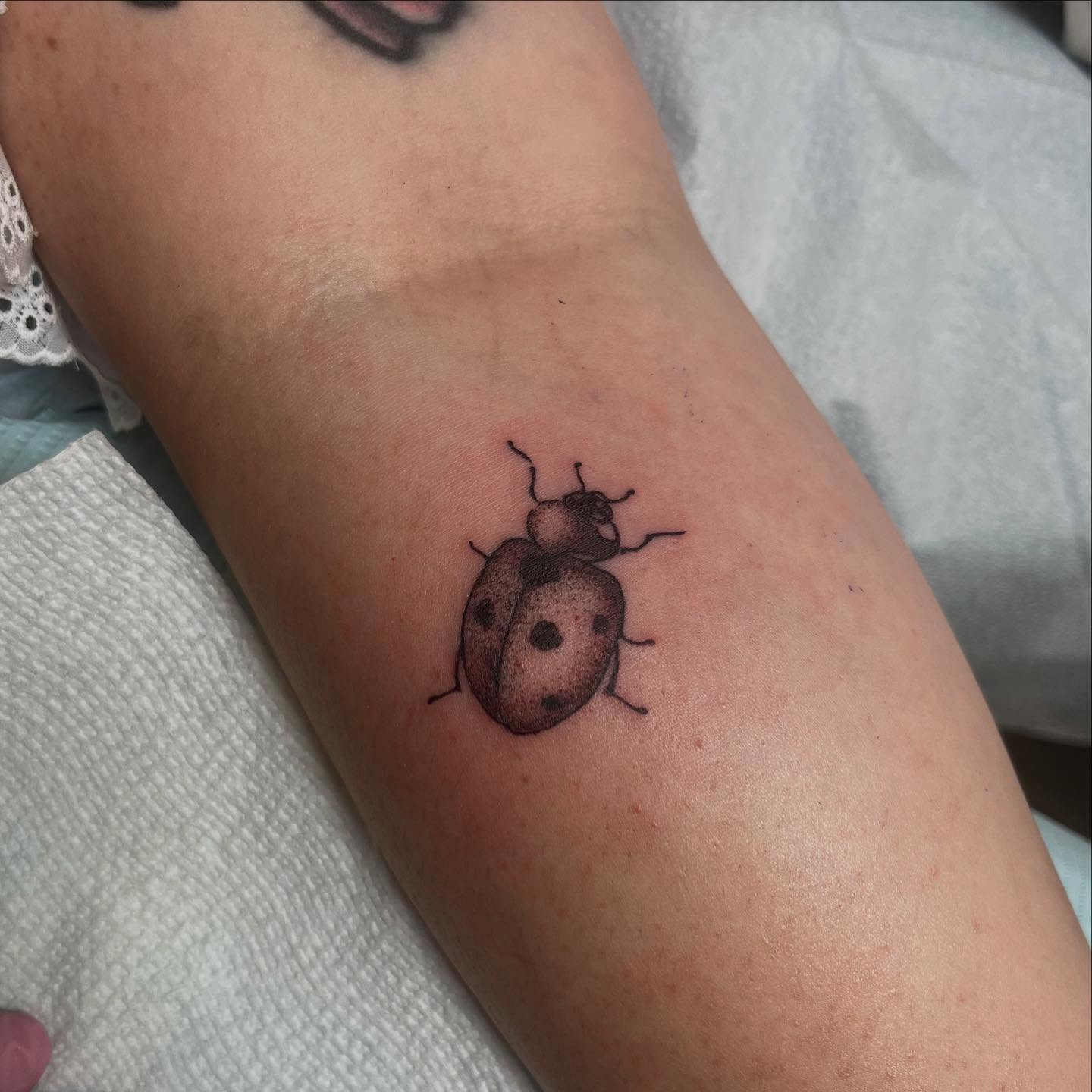 The tattoo features a ladybug rendered with distinct black spots and a textured shell that adds depth.