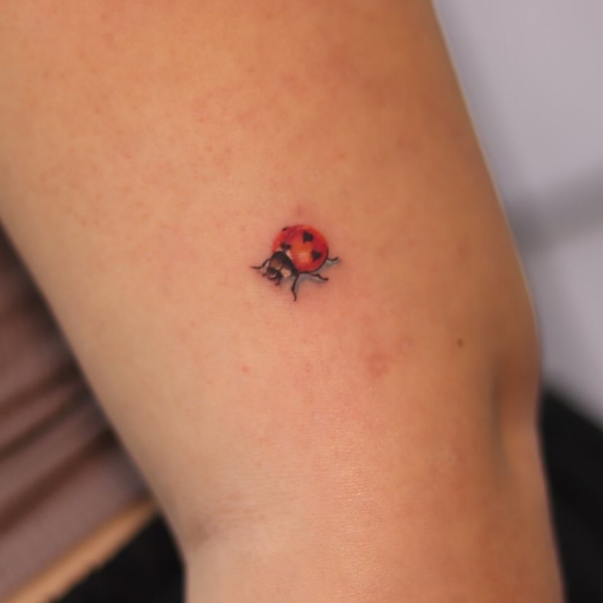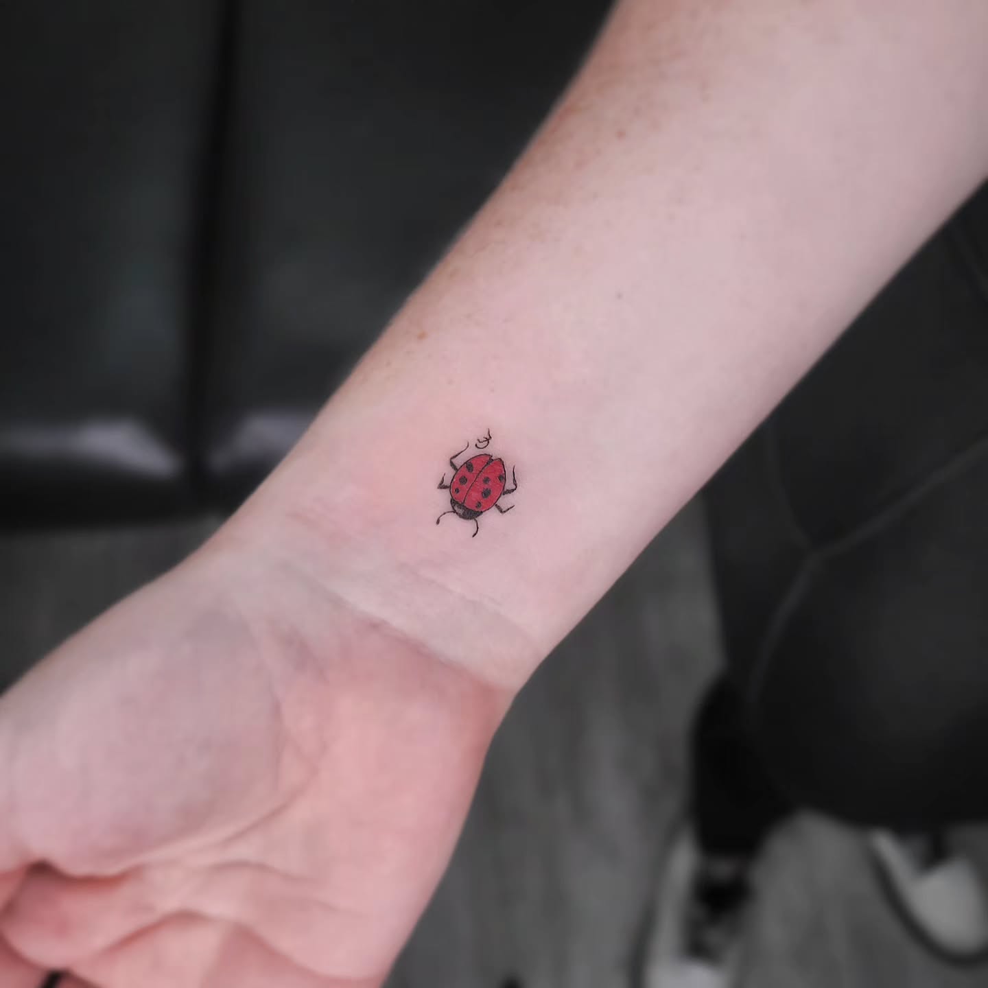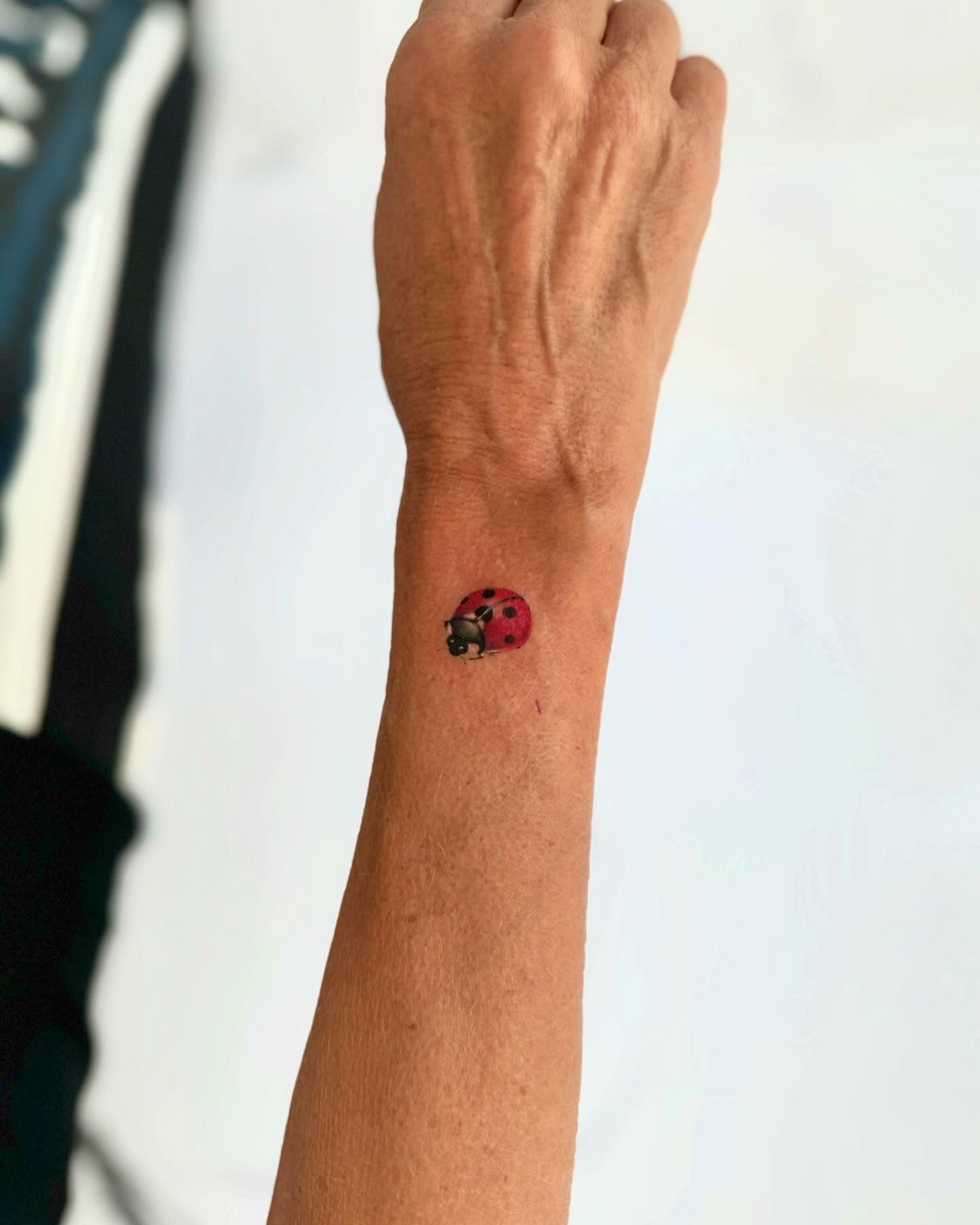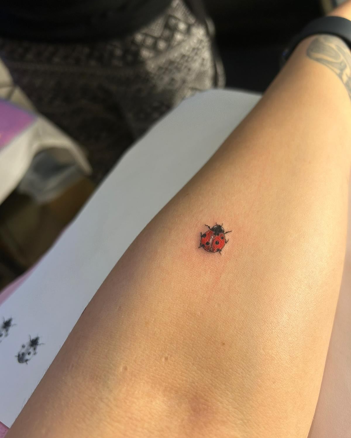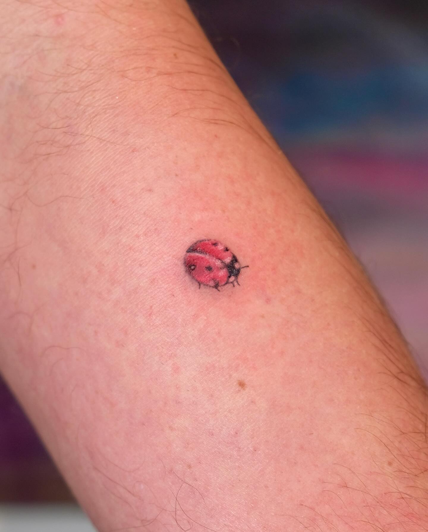 A tiny ladybug tattoo features vibrant red and black colors that stand out against the skin.