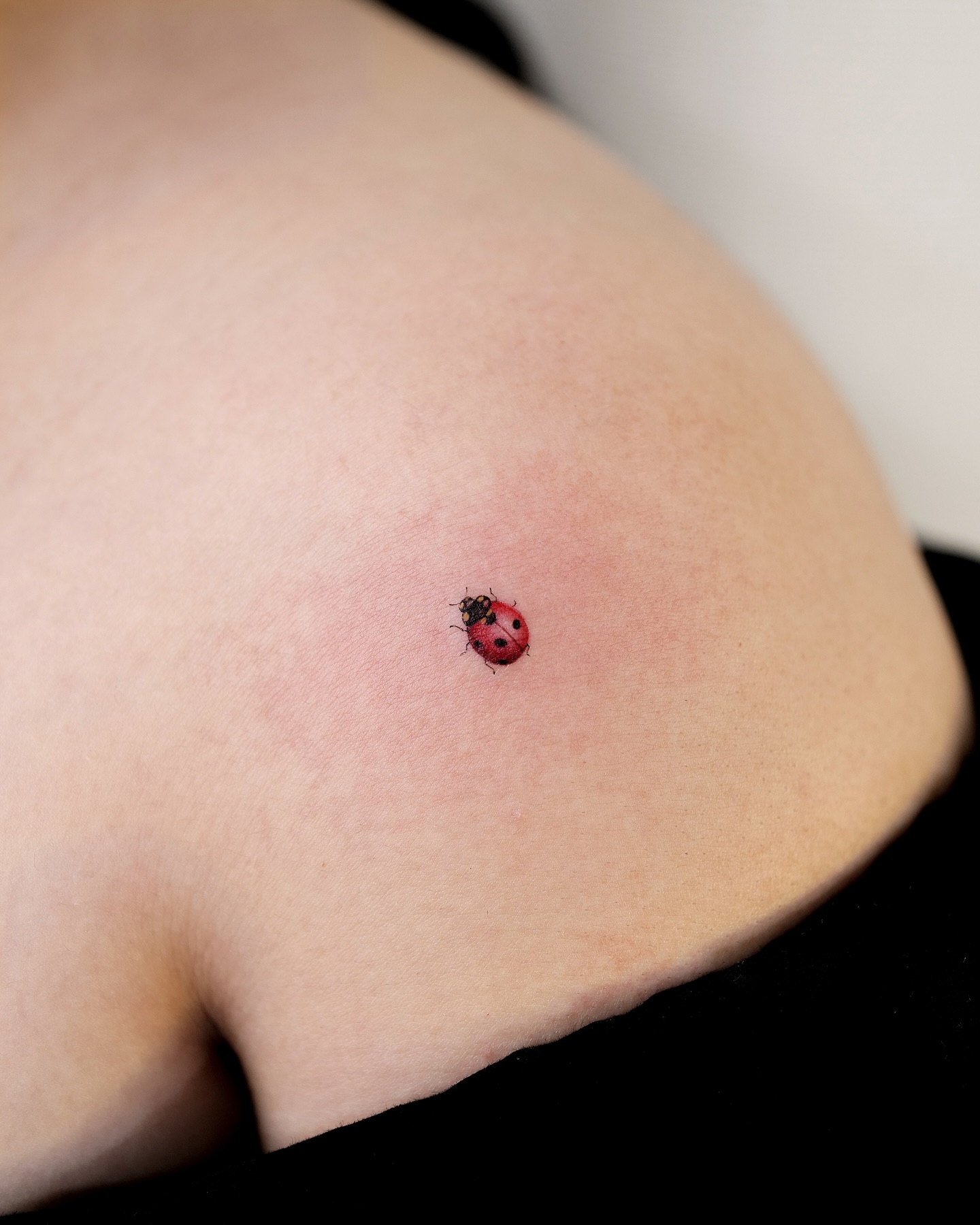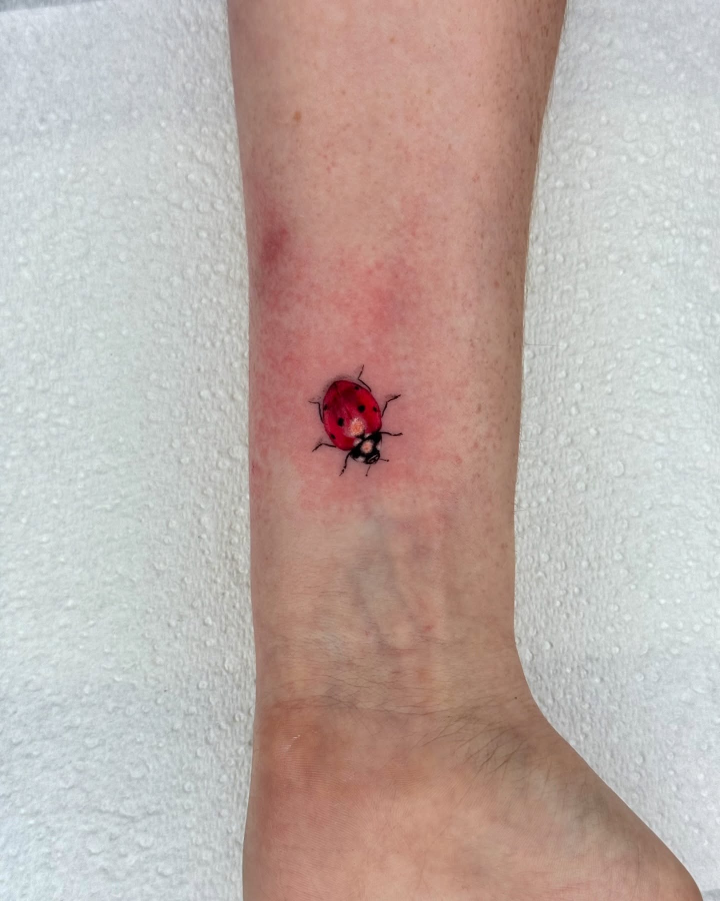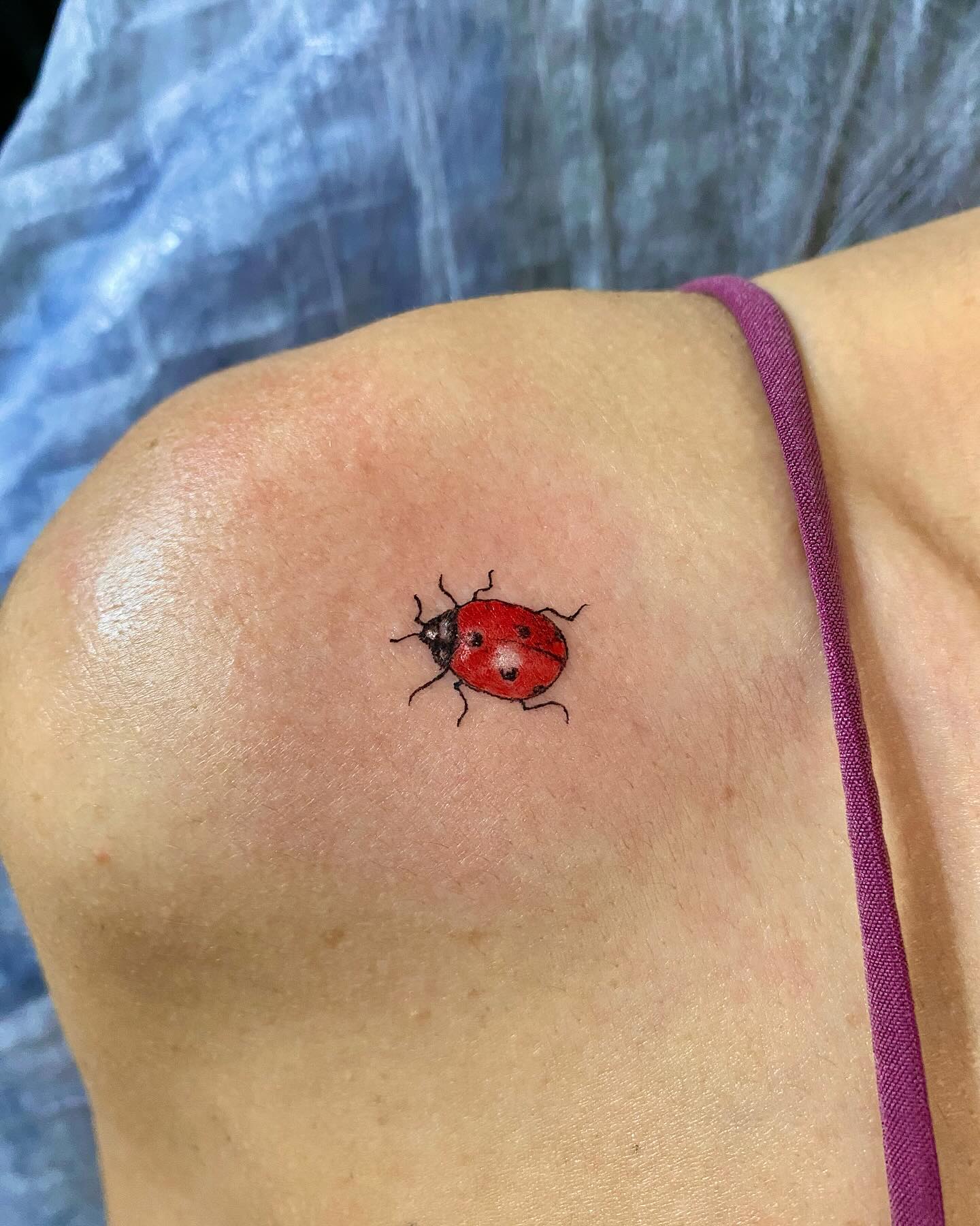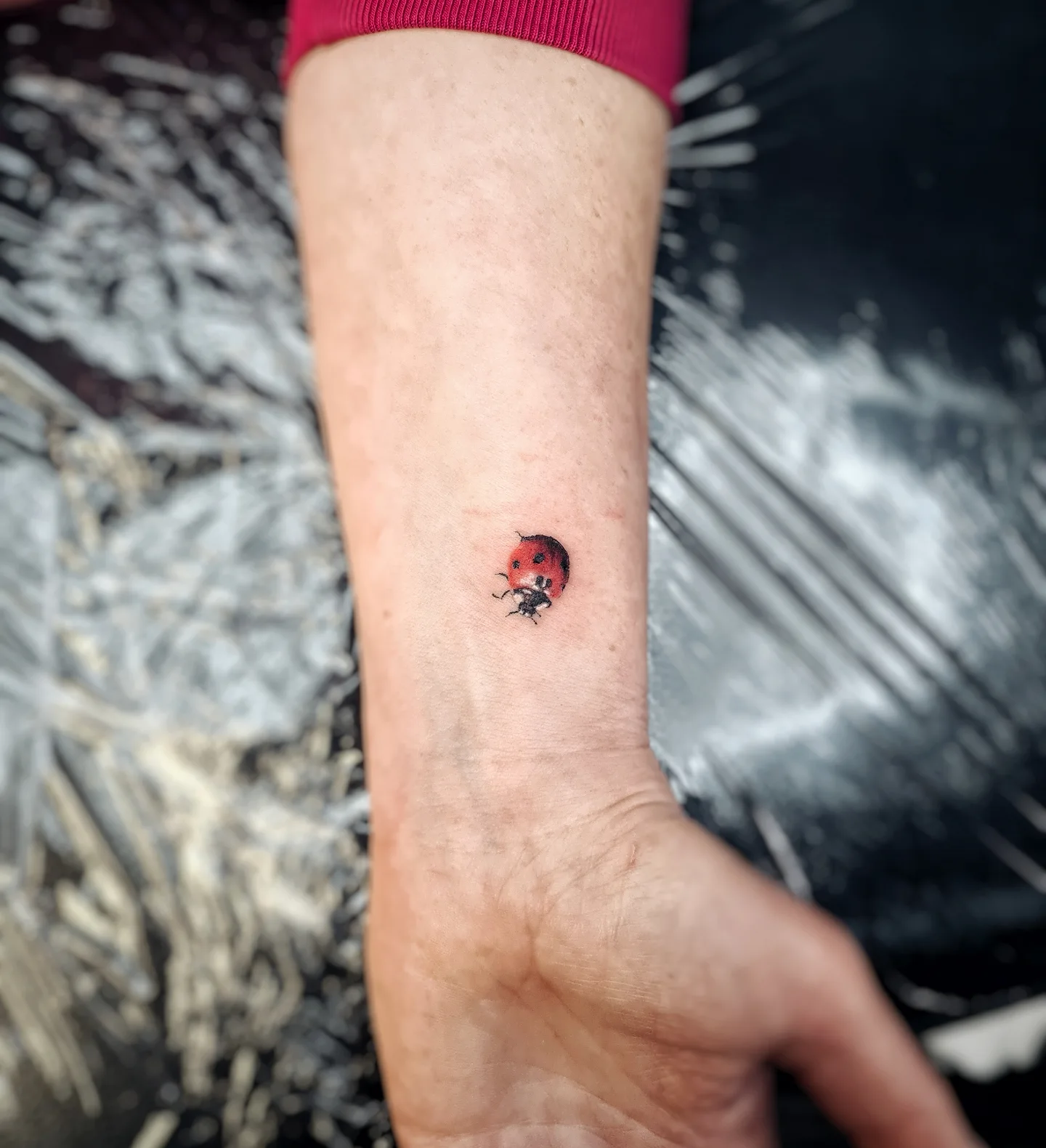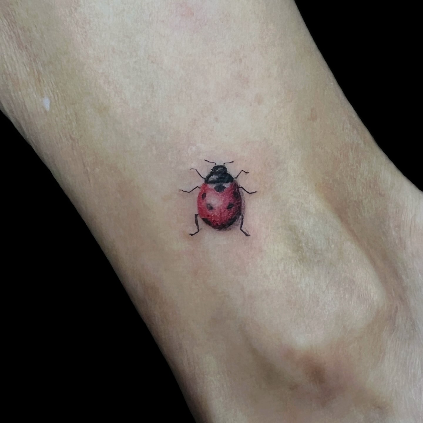 A tiny ladybug tattoo features vibrant red and black colors that stand out against the skin.