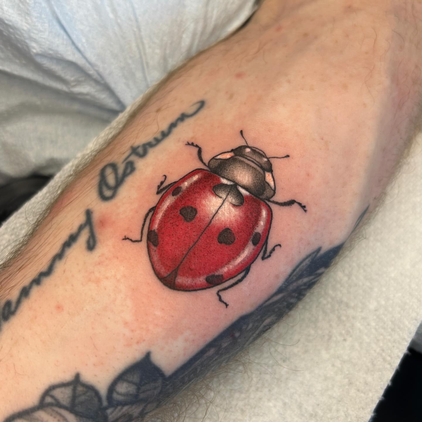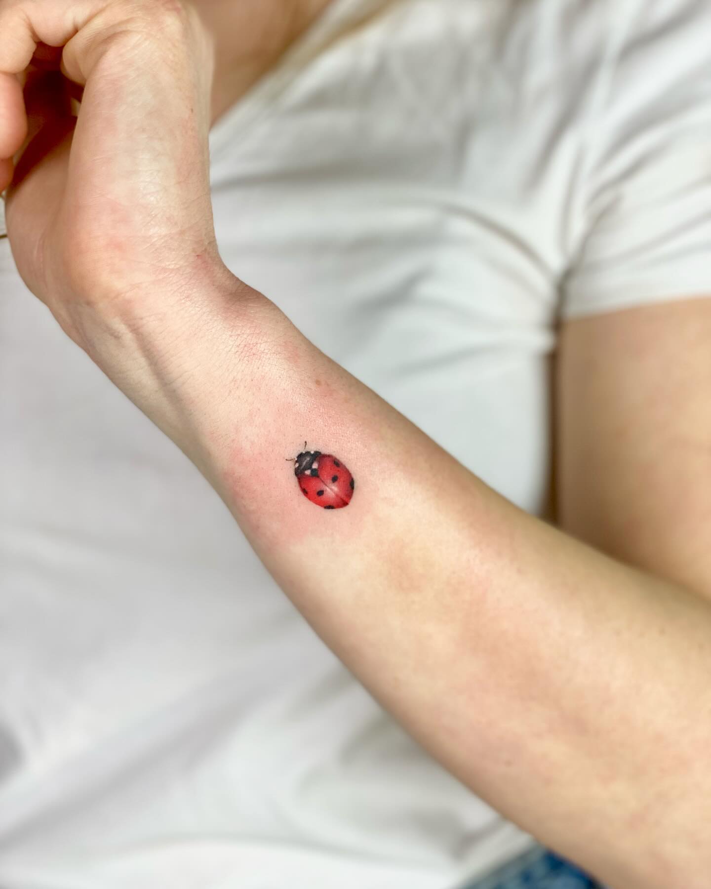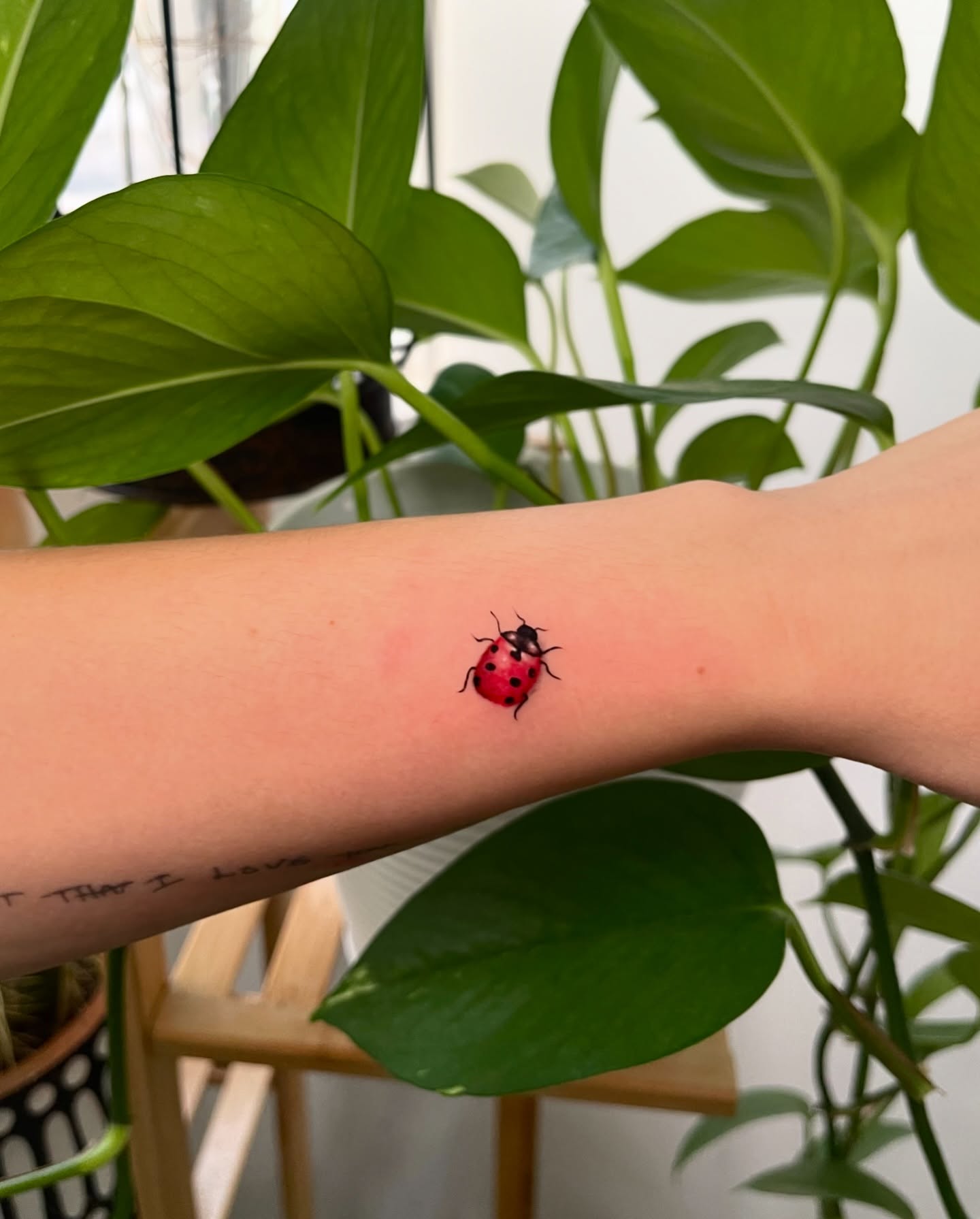 The tattoo’s realistic shading gives it a three-dimensional effect, making it appear as if the ladybug is crawling on the arm.