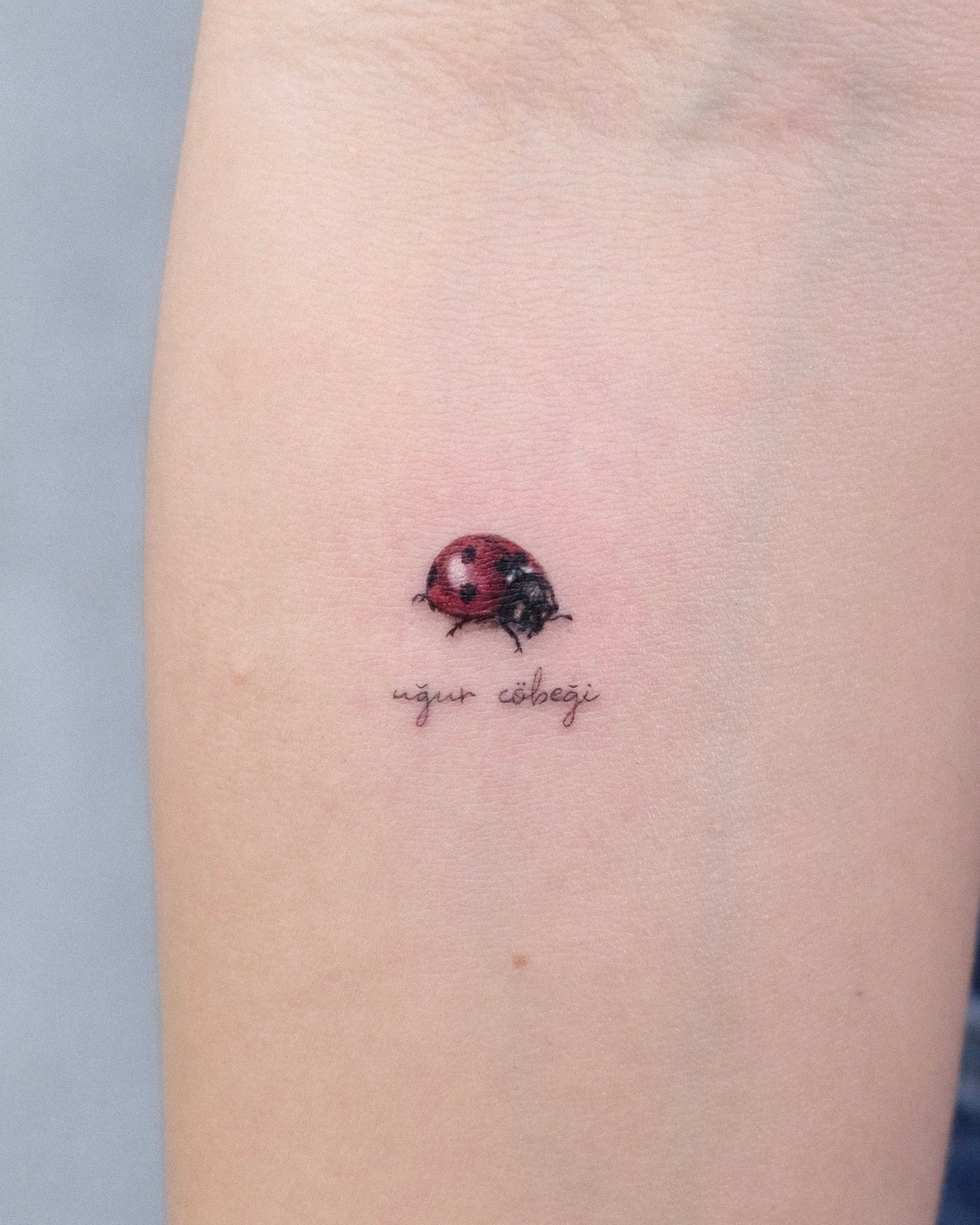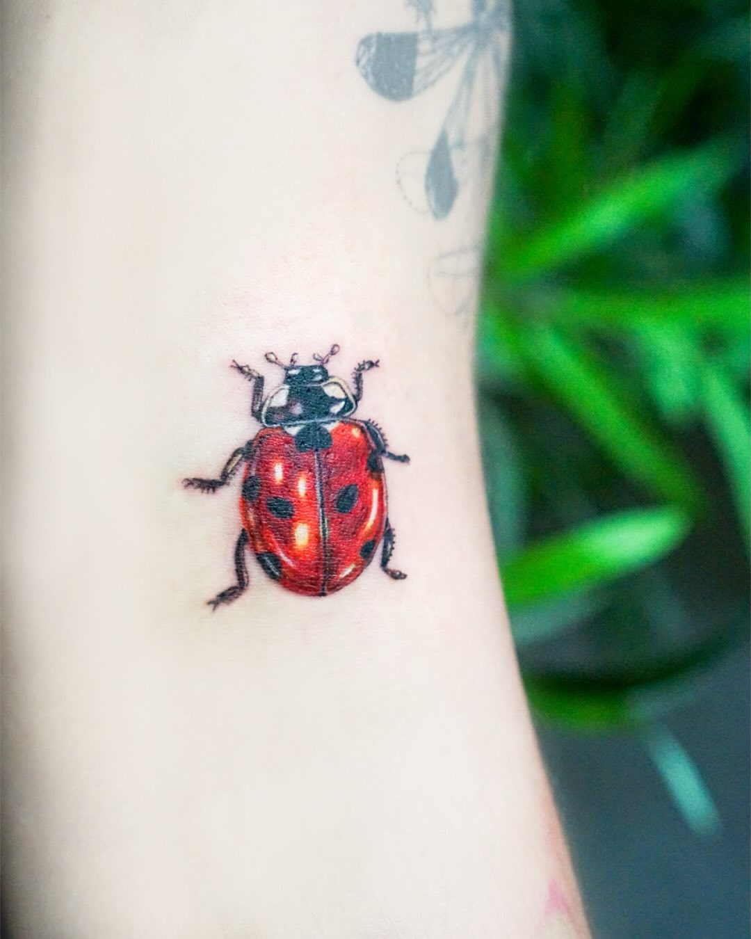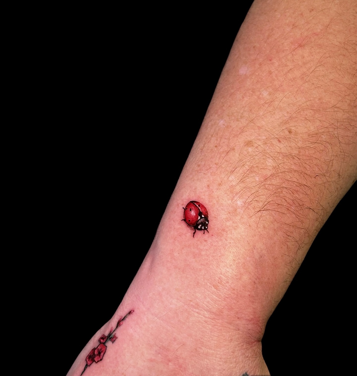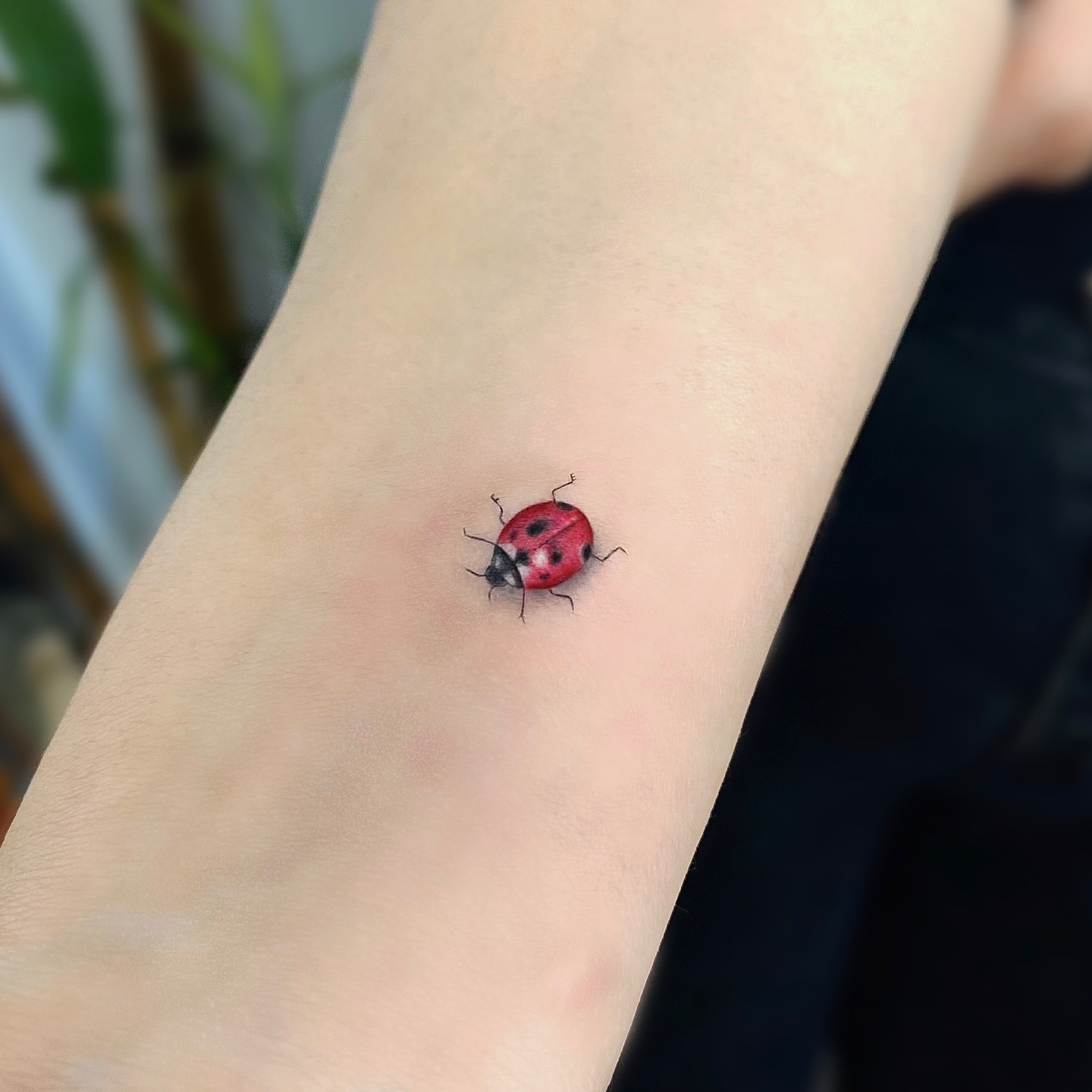 The tattoo’s realistic shading gives it a three-dimensional effect, making it appear as if the ladybug is crawling on the arm.