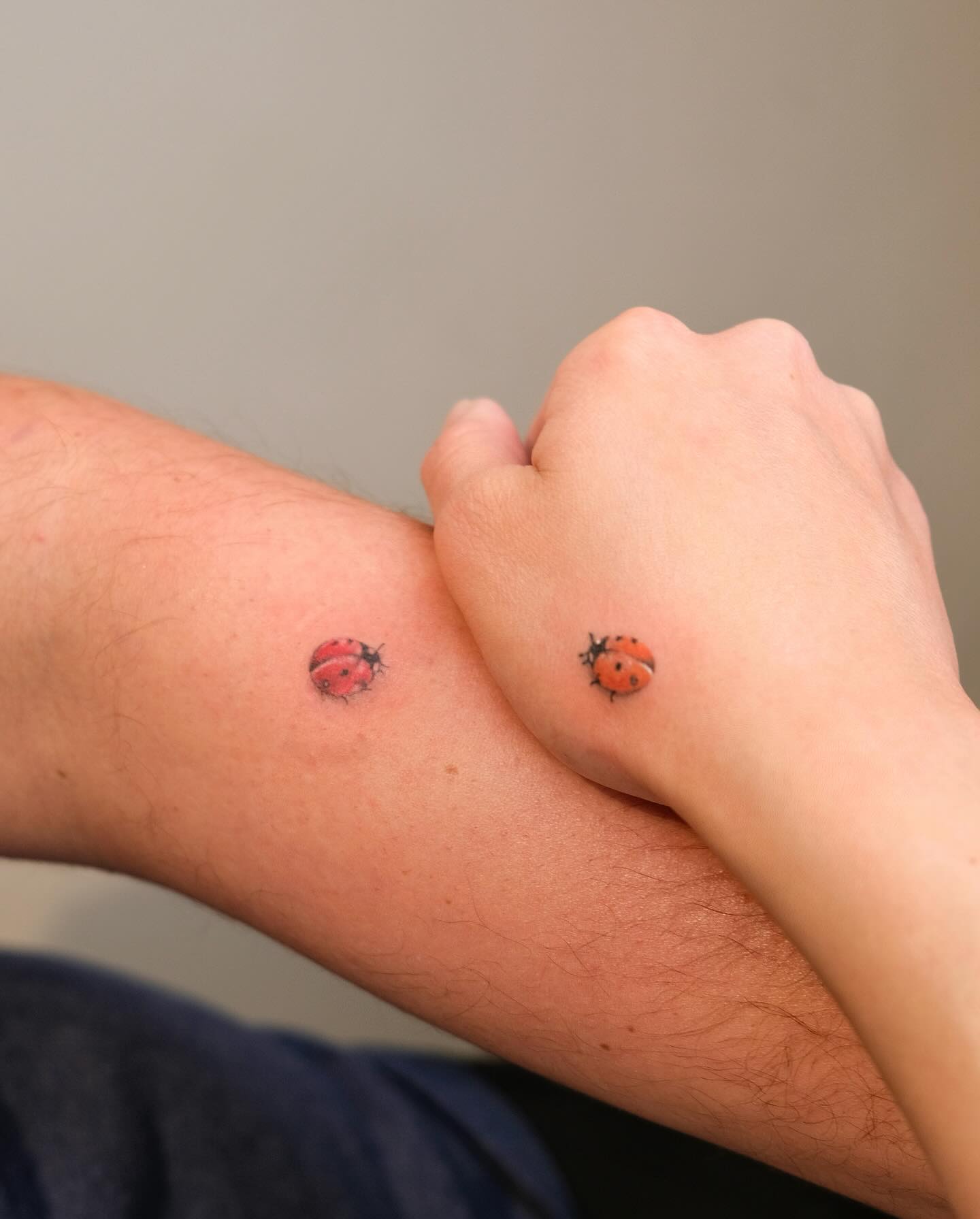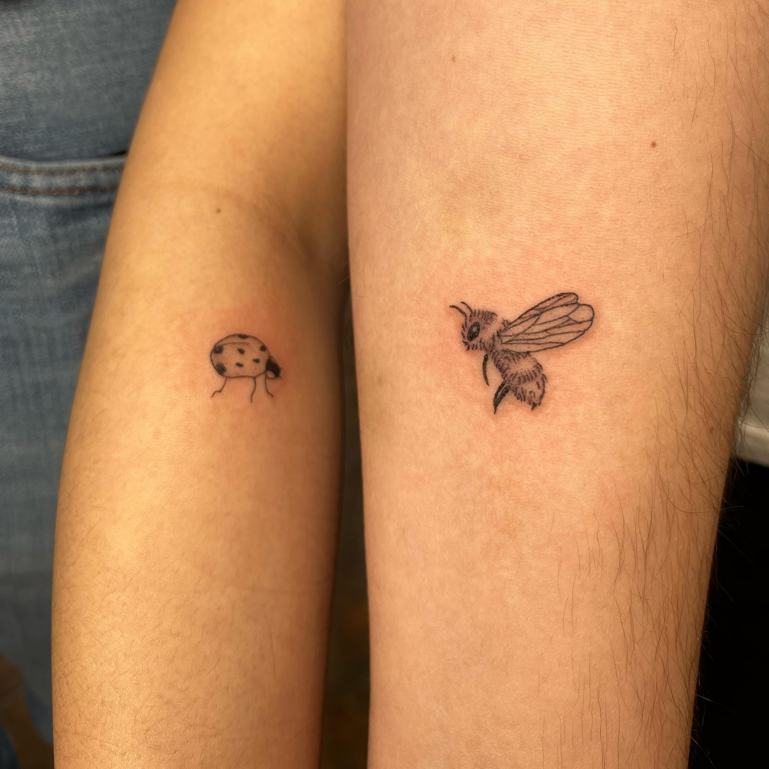 The small ladybug and bee tattoos feature simple outlines and minimal shading, making them subtle yet evocative.