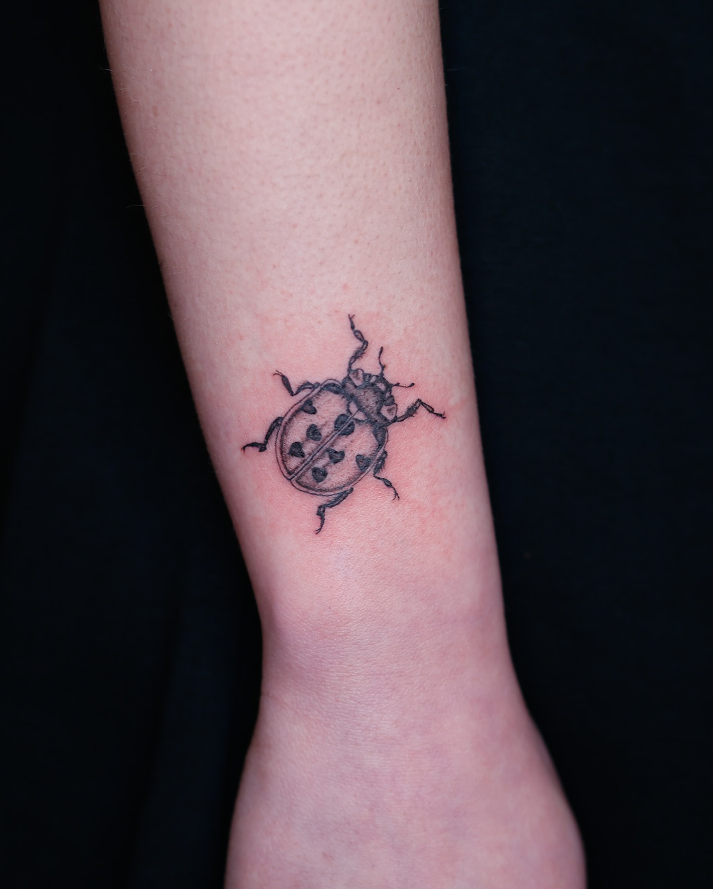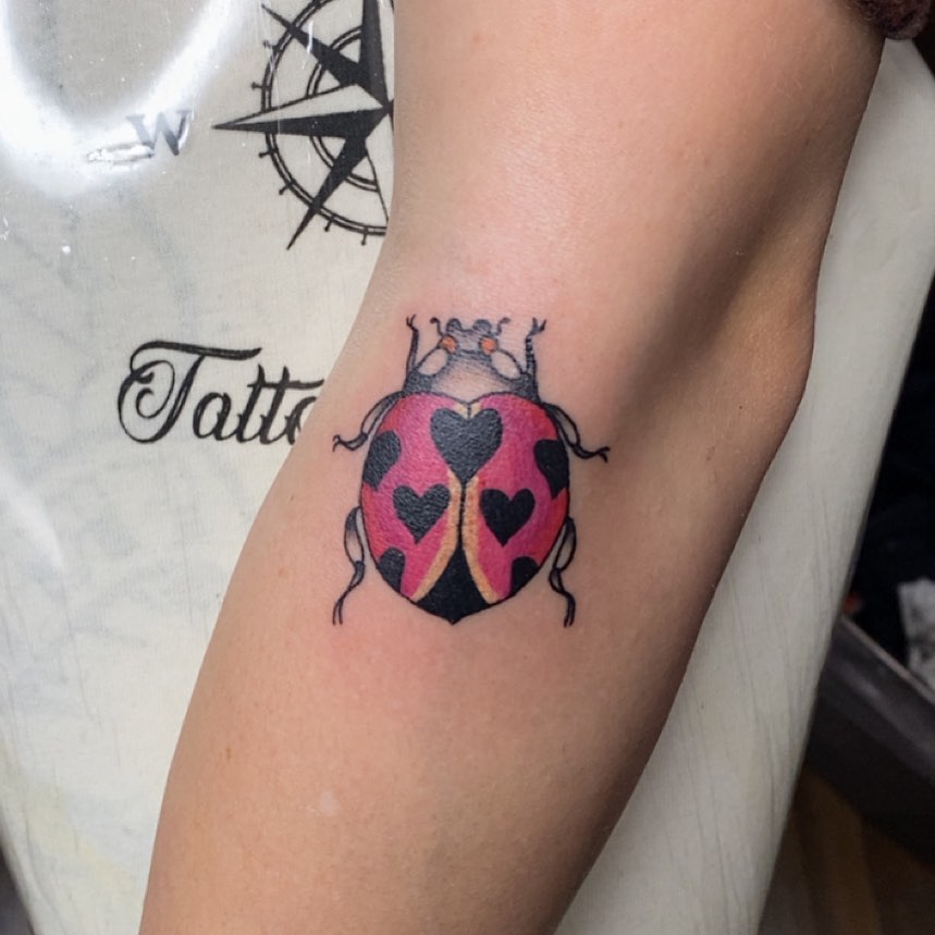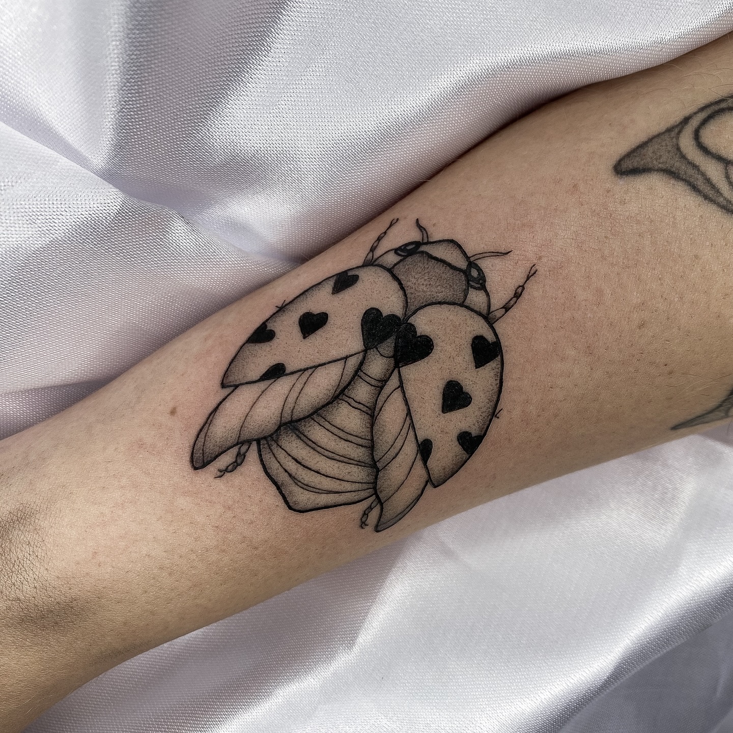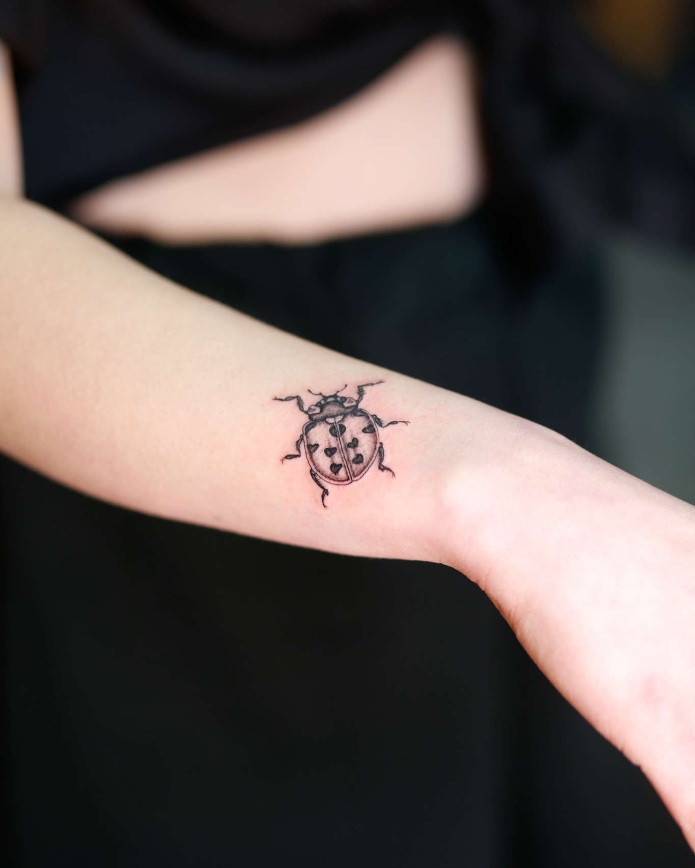 The tattoo features a ladybug adorned with distinctive heart-shaped spots, creating a fun and playful design.
