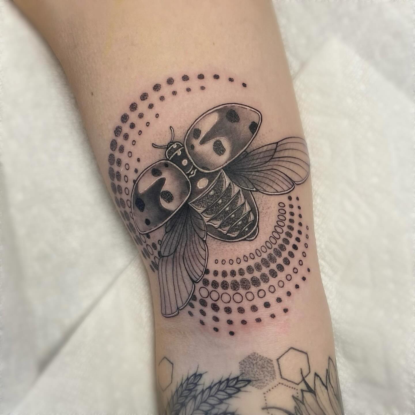 The tattoo features a ladybug with distinctive black spots and intricate dot patterns surrounding it.