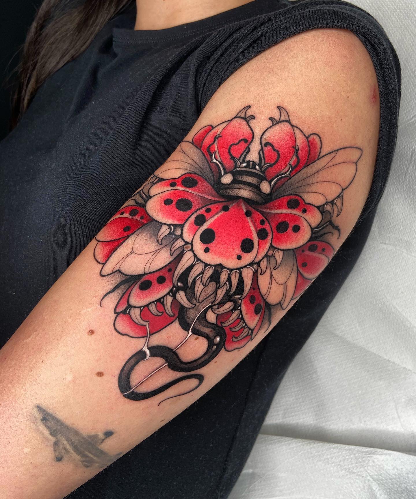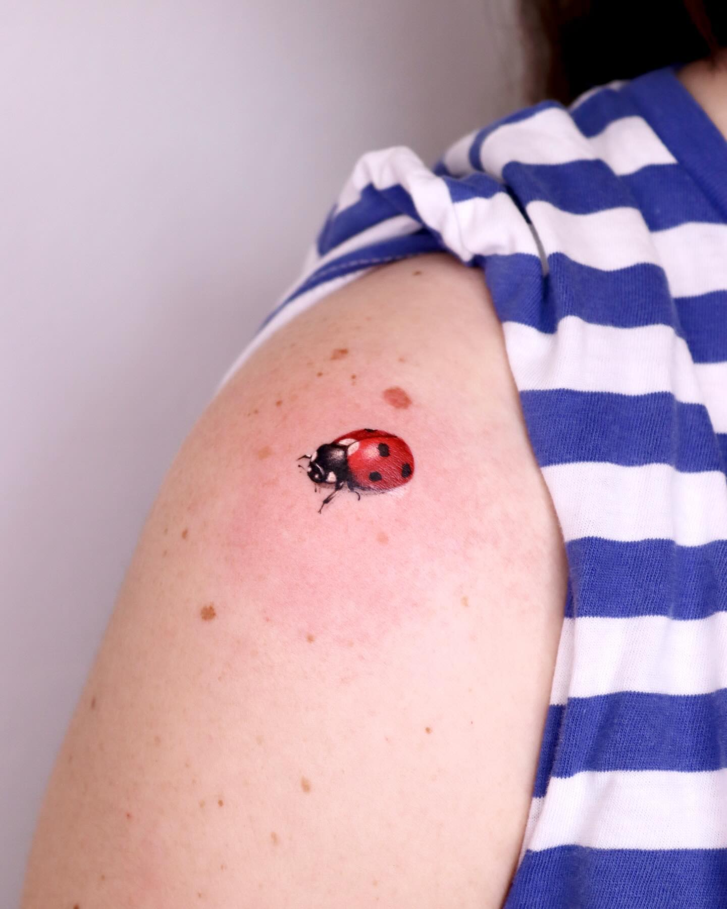 The tattoo features a lifelike ladybug with vibrant red and black markings, positioned on the shoulder.