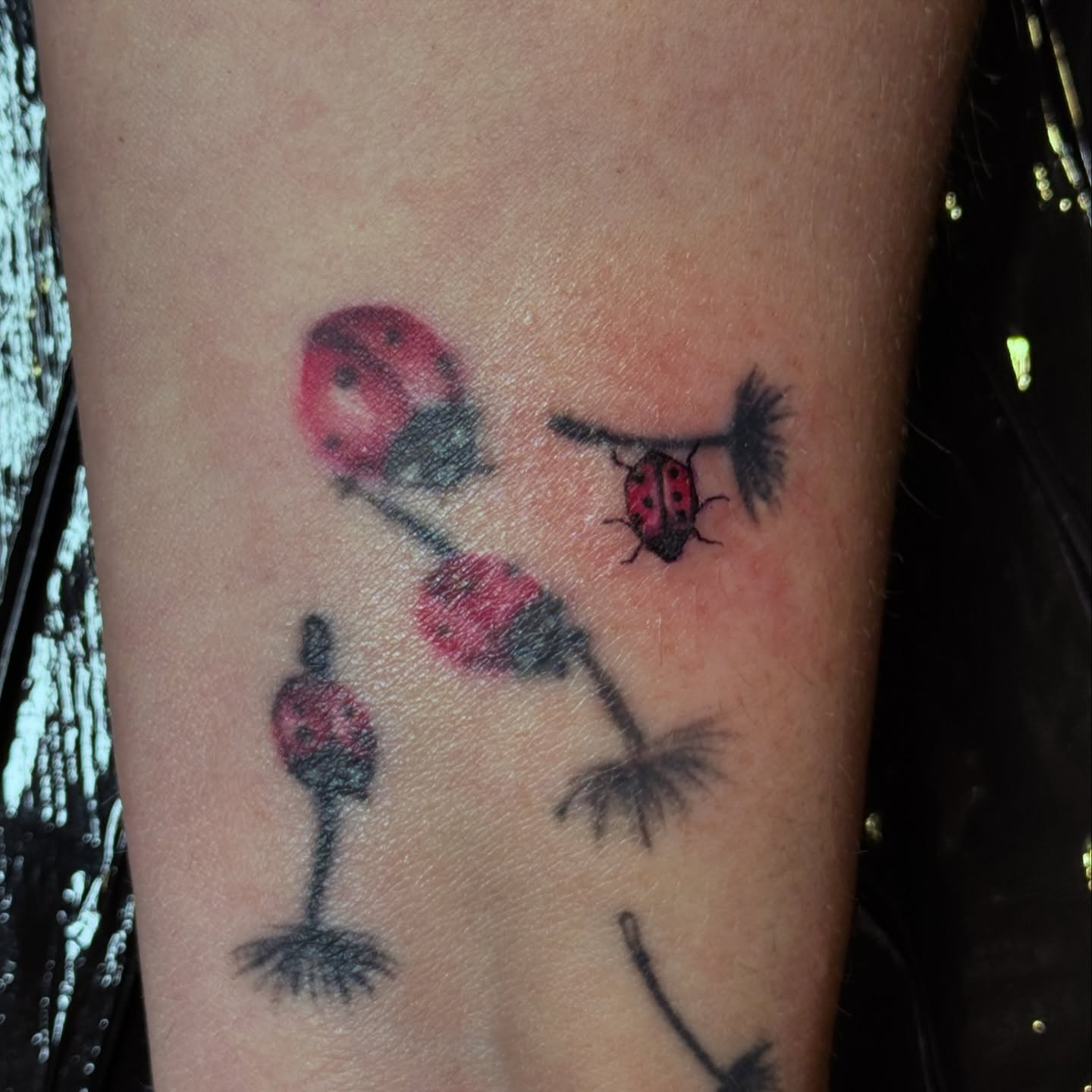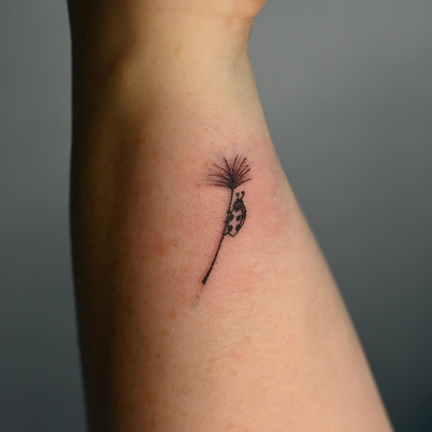 The tattoo features vibrant ladybugs paired with delicate dandelion elements.