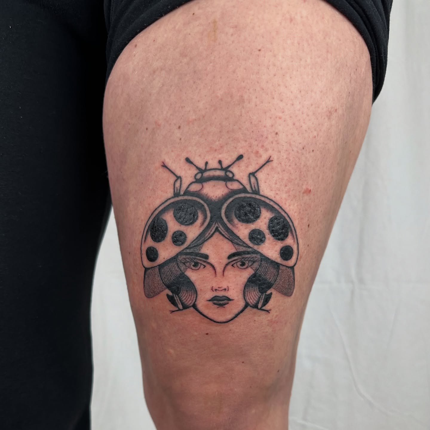 The tattoo features a unique blend of a woman’s face with ladybug elements incorporated into the design.