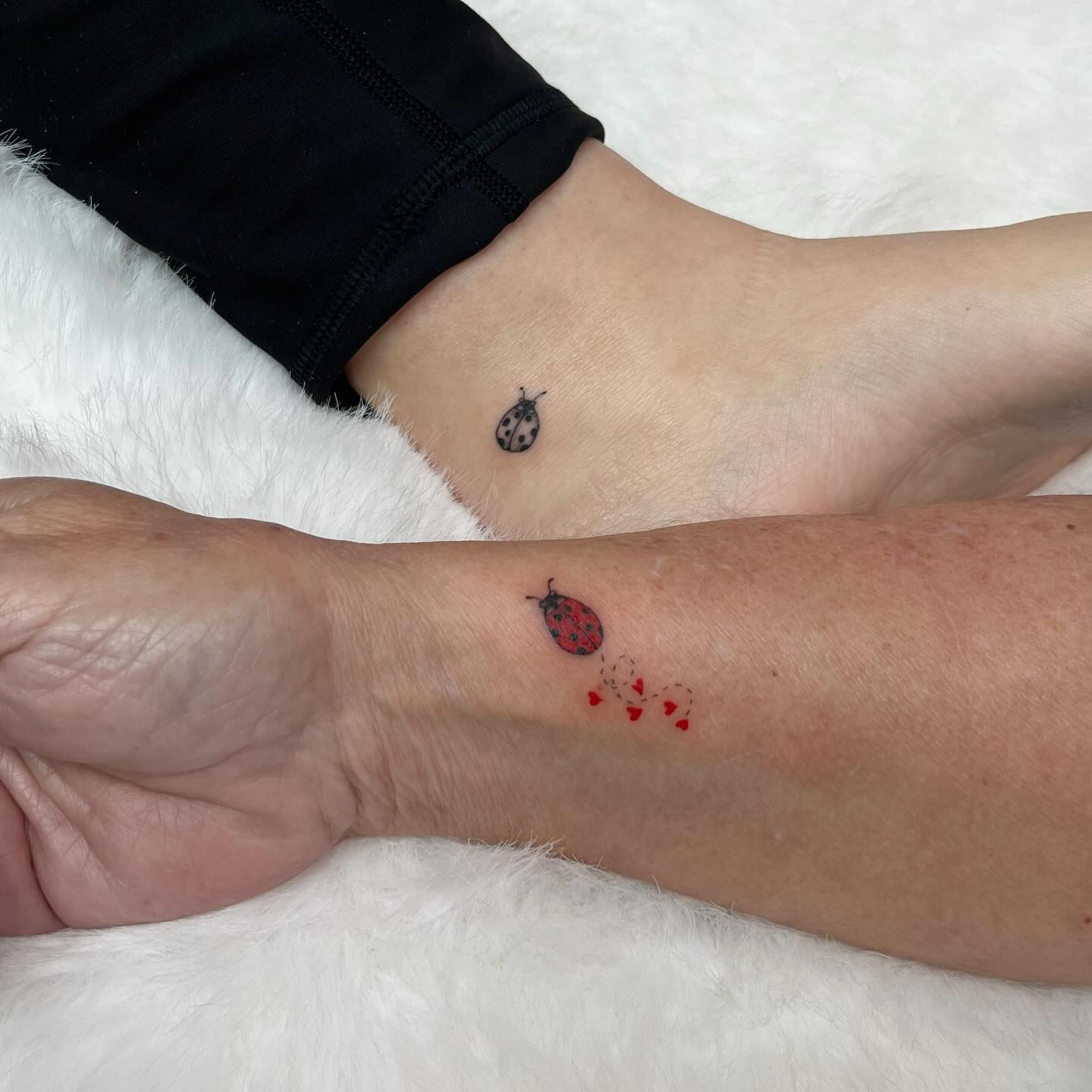 The image features two distinct ladybug tattoos, one in black and the other in red, each placed on different parts of the body.