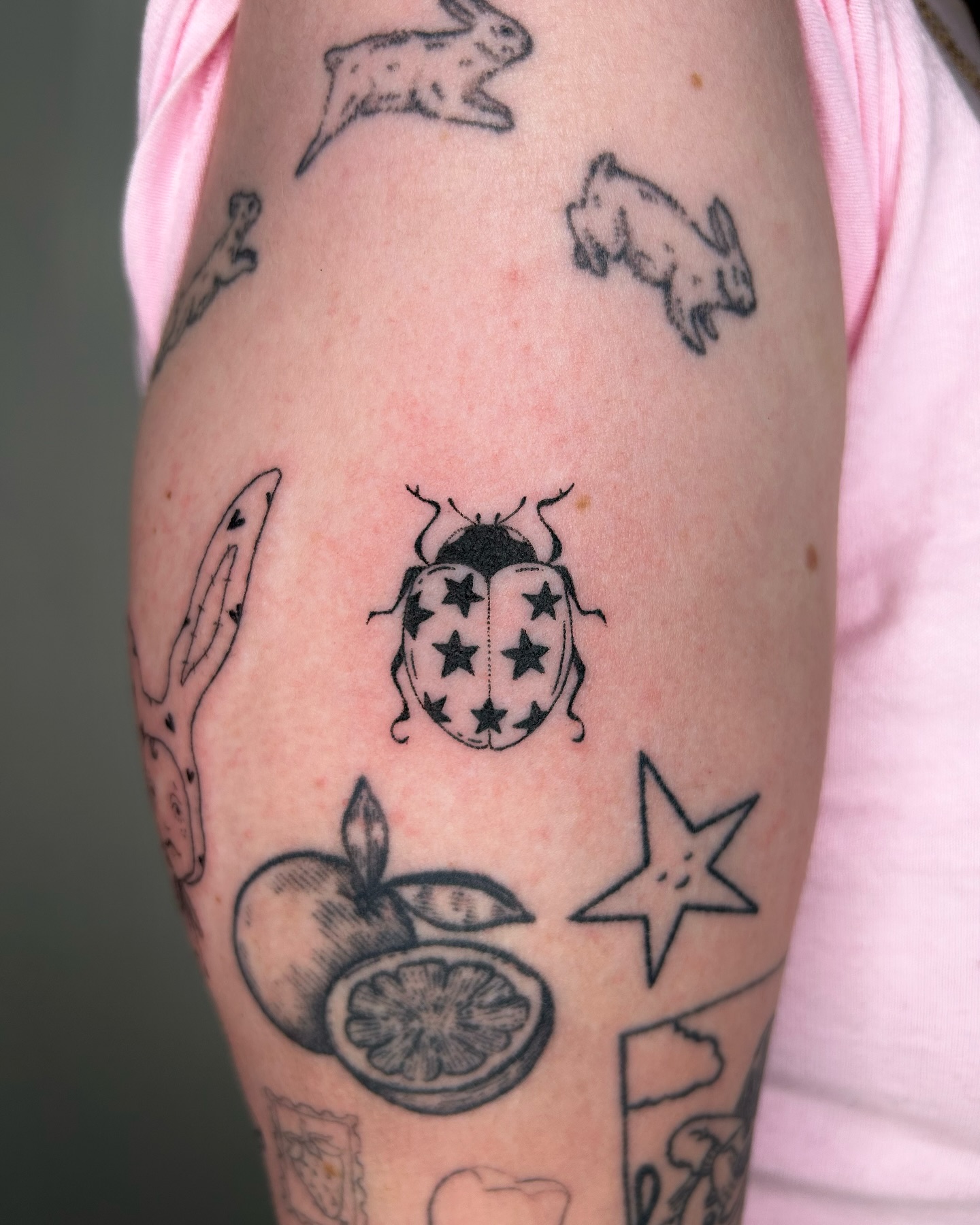The tattoo features a ladybug prominently decorated with star shapes, creating a unique and whimsical appearance.