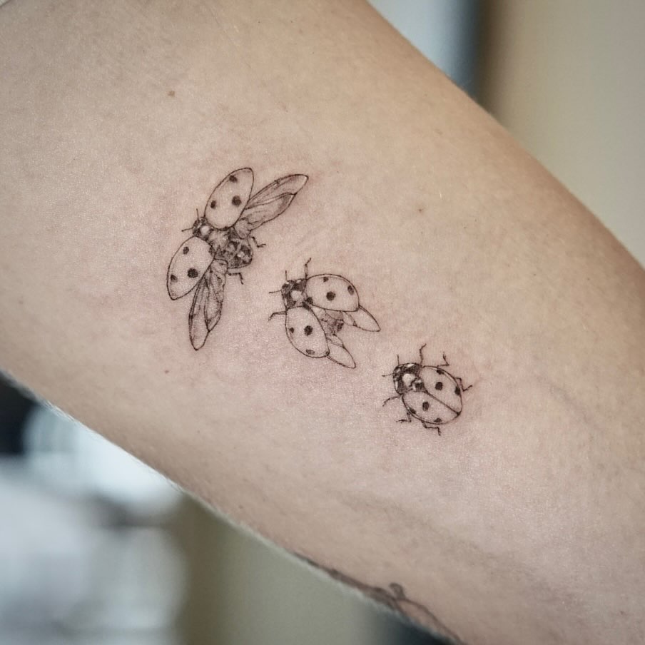 The intricate detailing, including the spots and shading, brings the tattoos to life, highlighting the artist’s skill in capturing the essence of these charming insects.