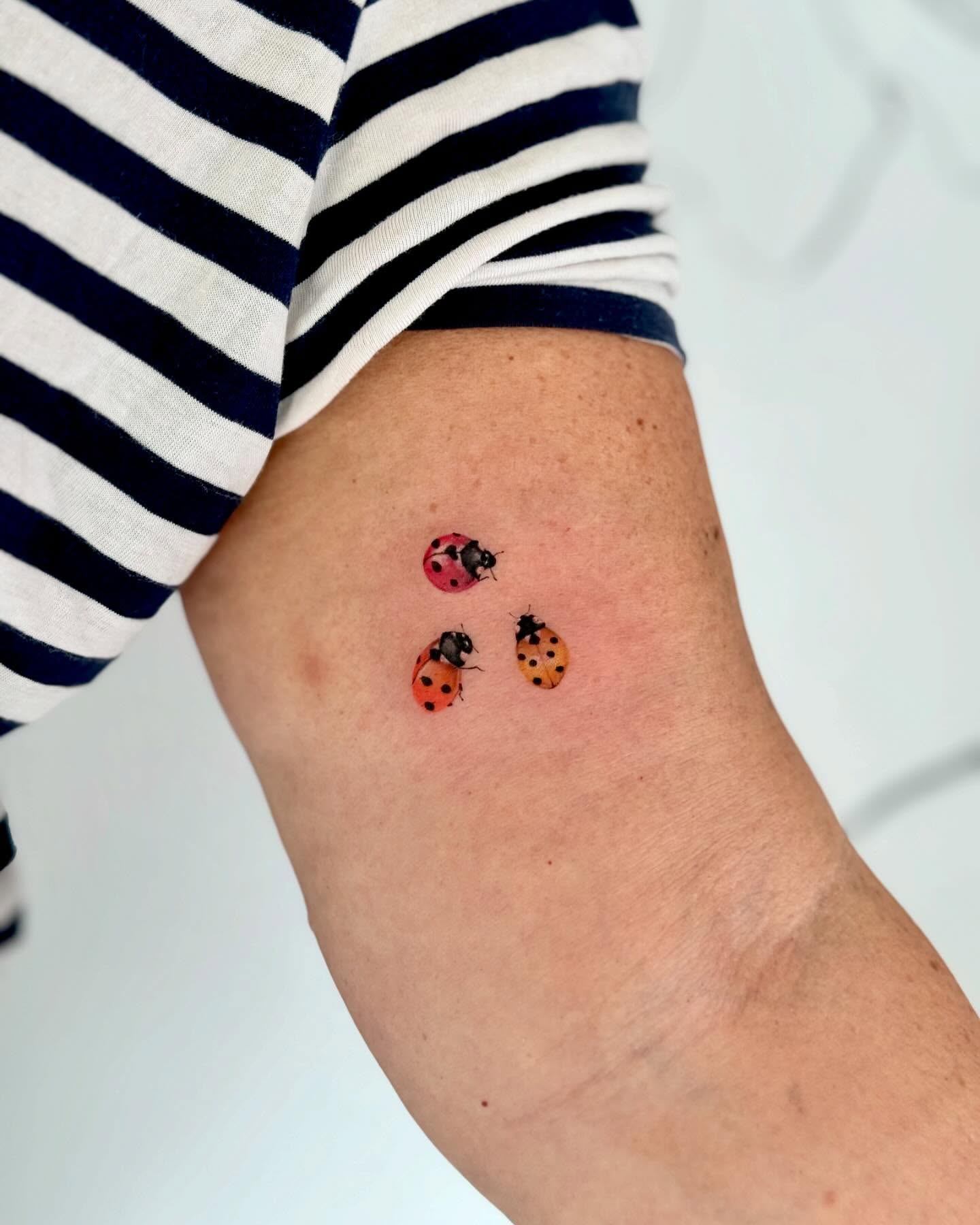 The tattoos are designed with realistic shading, creating a three-dimensional effect that makes the ladybugs appear lively and dynamic.