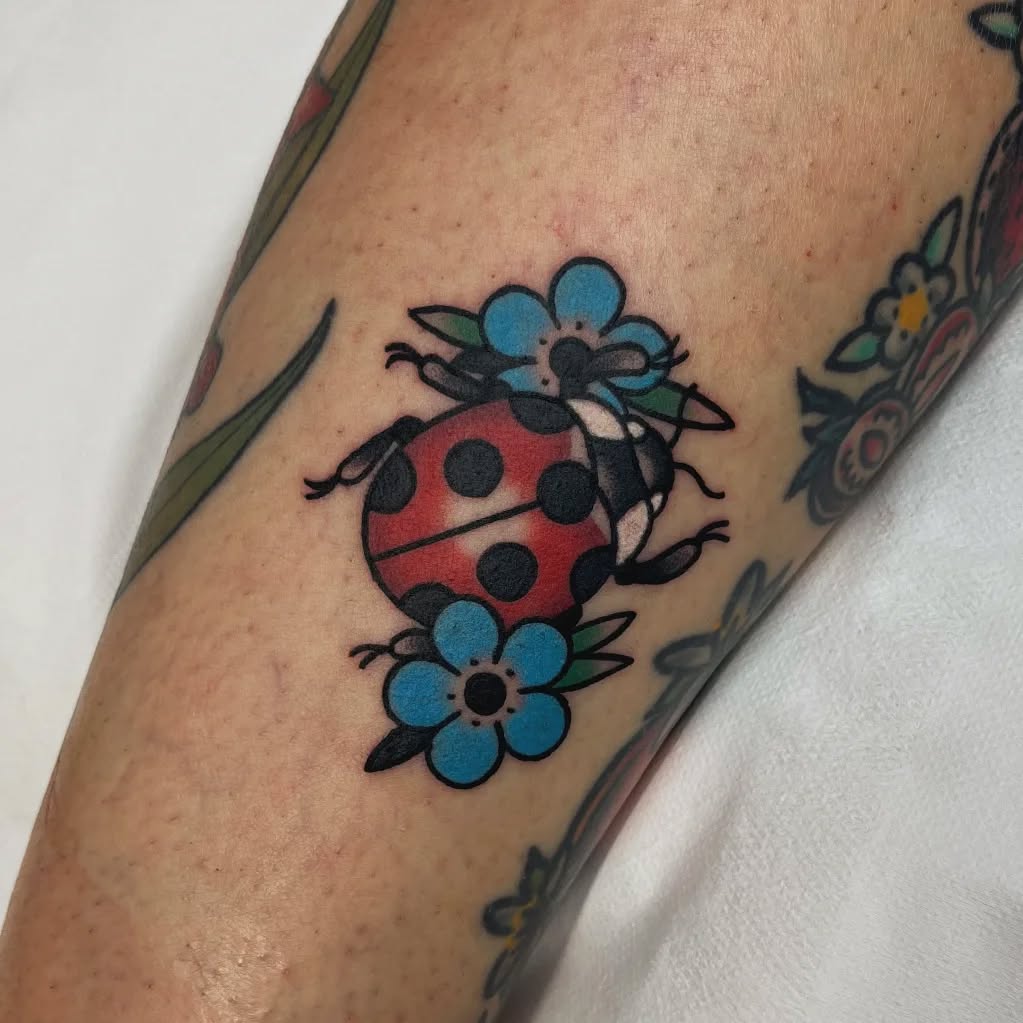 The tattoo features a vibrant ladybug adorned with bright red and black patterns, surrounded by delicate blue flowers.