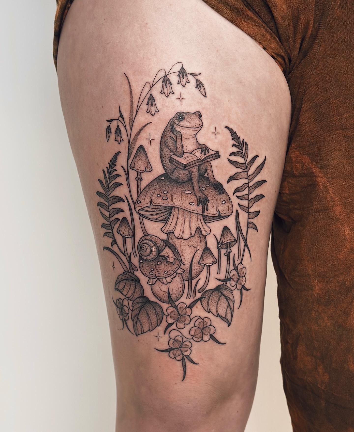 This tattoo showcases a playful frog perched on a mushroom, surrounded by delicate flowers and ferns. The intricate details make it a charming piece that beautifully blends elements of nature and whimsy. For those considering thigh tattoos, choosing a design that reflects personal interests, like nature, can create a meaningful connection.