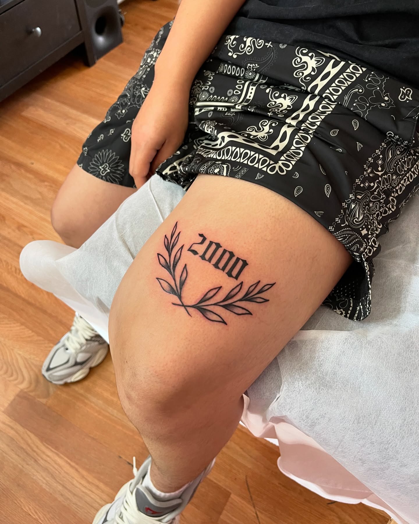 This image showcases a striking tattoo featuring the year “2000” wrapped in a delicate laurel wreath. The choice of this design symbolizes achievement and progress, making it a meaningful expression for many. For those considering thigh tattoos, opting for a personal milestone can create a powerful reminder of one s journey.