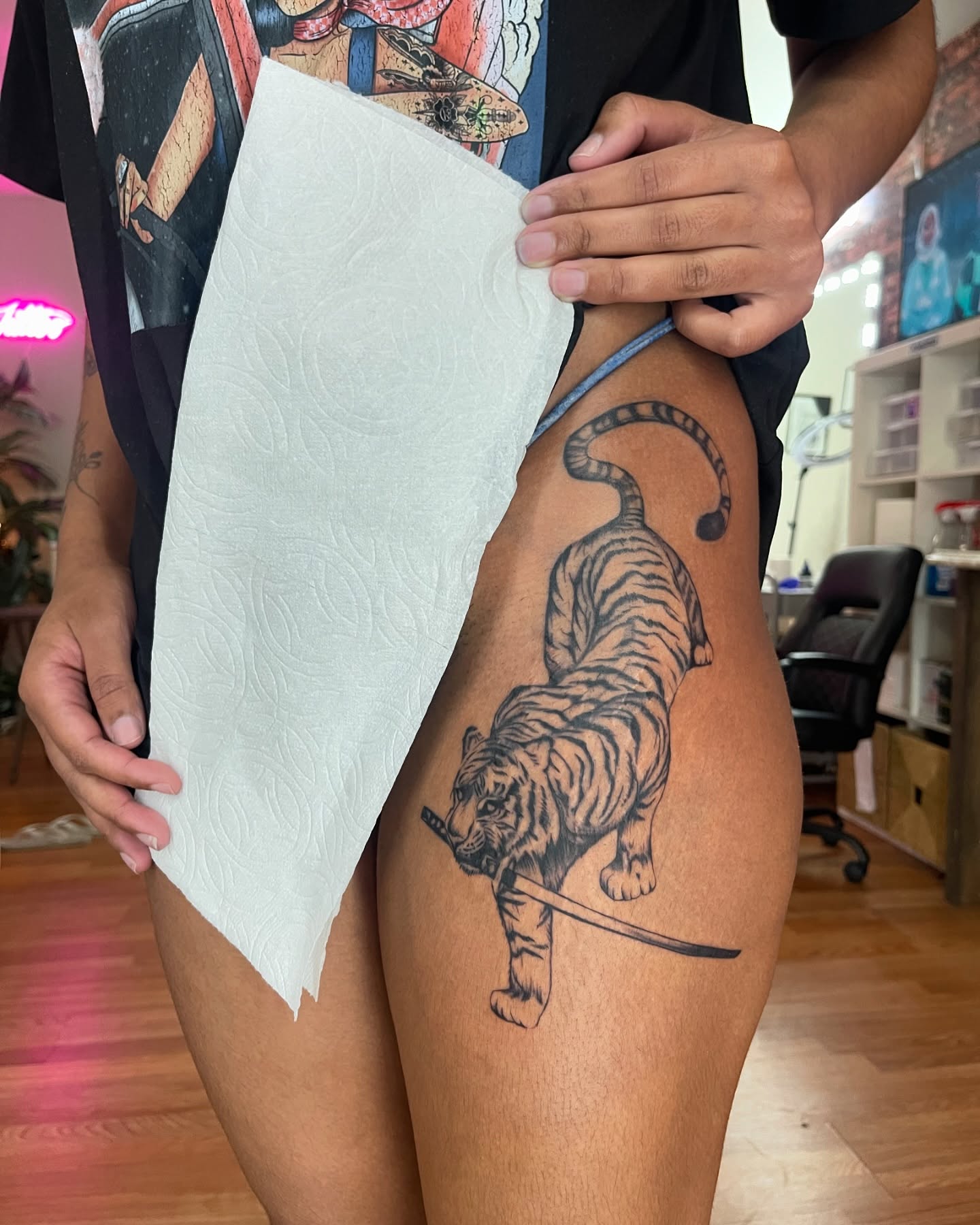 This striking image showcases a fierce tiger tattoo, beautifully inked on a woman’s thigh. The detailed design, complete with a sword, symbolizes strength and bravery, making it a powerful choice for body art. When considering thigh tattoos, it s important to choose a design that resonates personally, as these pieces can tell unique stories about the wearer.