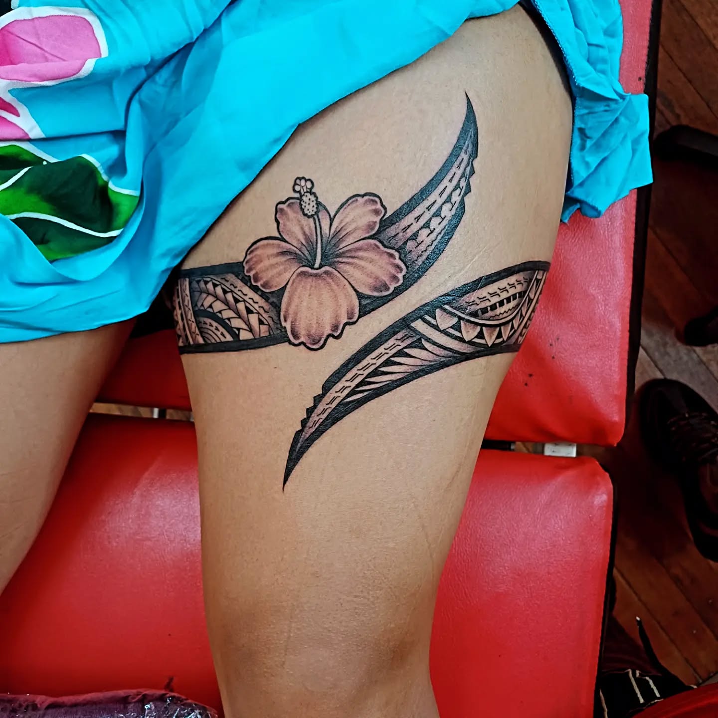 This image showcases a stunning thigh tattoo featuring a delicate hibiscus flower, beautifully intertwined with intricate patterns. The combination of bold lines and soft colors creates a striking contrast that draws the eye. For those considering a similar design, choosing a flower that holds personal meaning can make the tattoo even more special.