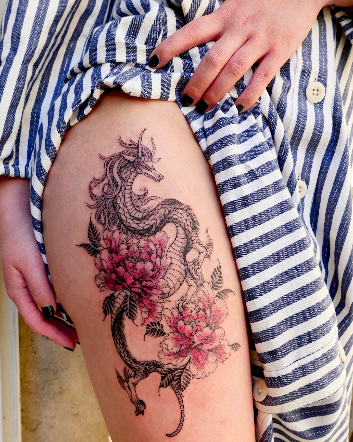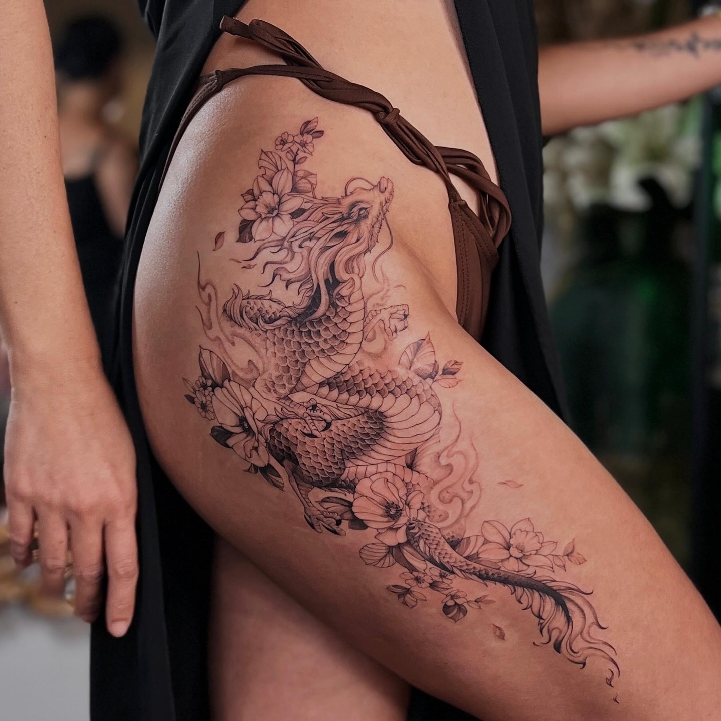 This stunning tattoo combines the fierce beauty of a dragon with delicate flowers, creating a striking visual that catches the eye. The intricate details and vibrant colors tell a story of strength and beauty, making it a perfect choice for someone looking to express their unique style. For those considering thigh tattoos, choosing designs that resonate personally can make the art feel even more special.