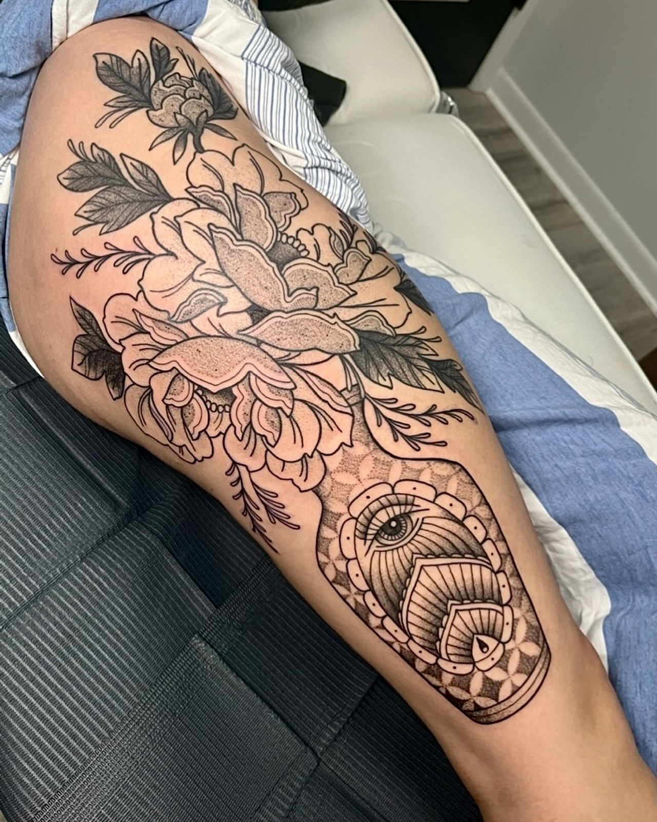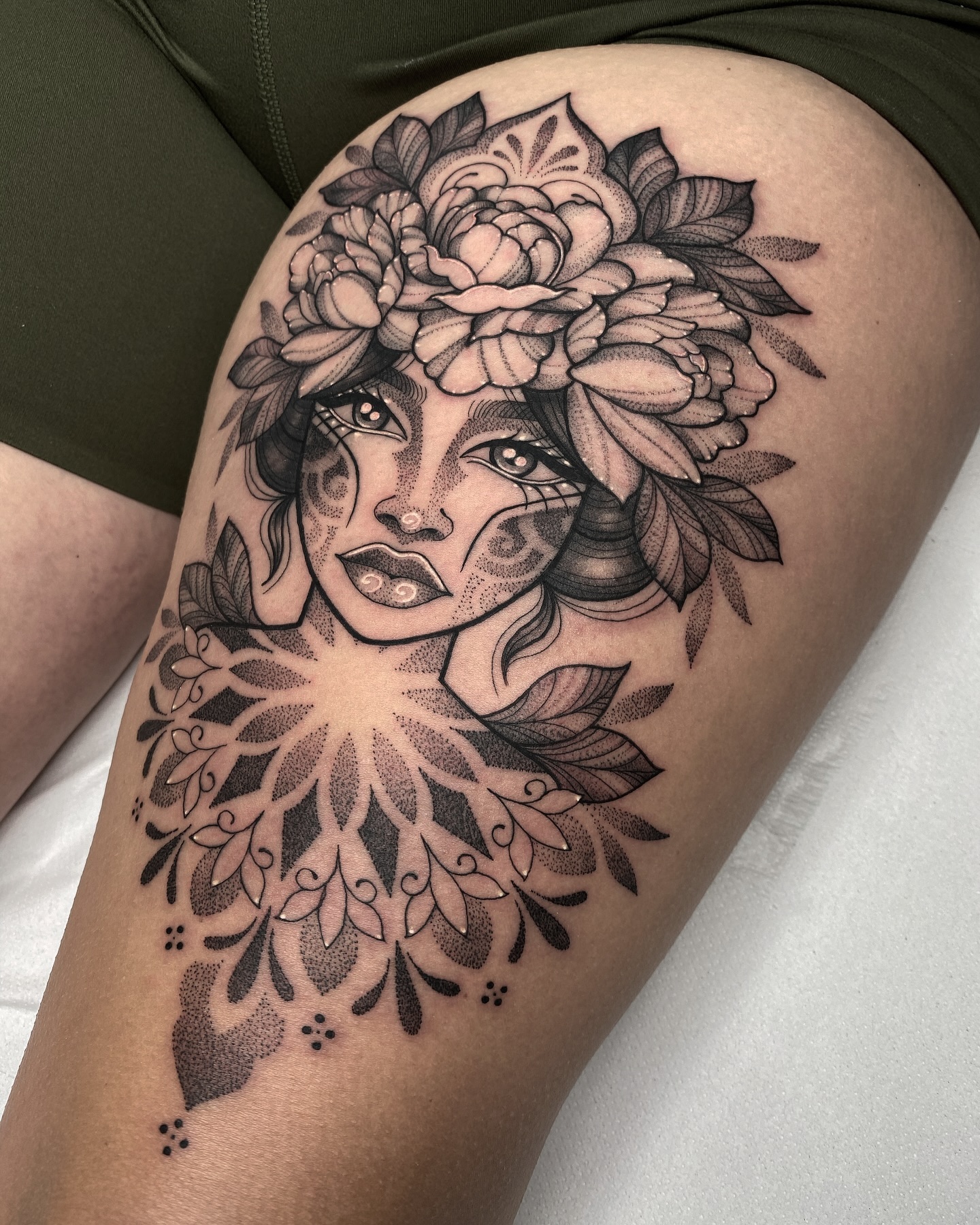 This stunning thigh tattoo beautifully combines intricate floral designs with a striking portrait. The detailed lines and shading create a mesmerizing effect that draws the eye in, showcasing the artist’s talent. For those considering a thigh tattoo, choosing a design that reflects personal stories or emotions can make it even more special.