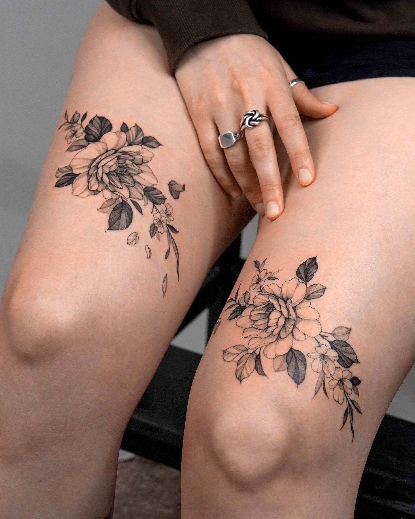 This image showcases stunning floral tattoos that elegantly adorn the thighs, creating a beautiful blend of nature and body art. The intricate details of the blooms and leaves bring a touch of charm, making the tattoos feel alive and vibrant. For those considering similar designs, choosing flowers that hold personal meaning can make the artwork even more special.