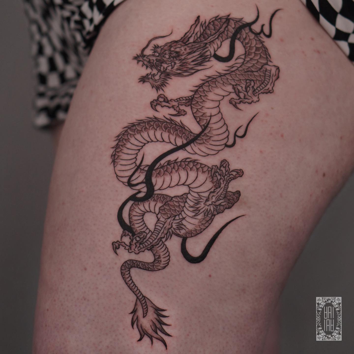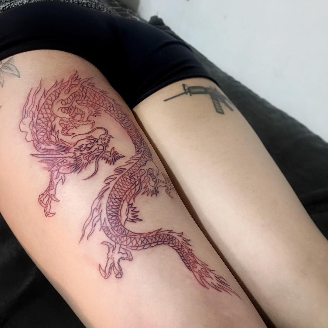 This stunning thigh tattoo features a beautifully detailed dragon that wraps elegantly around the skin. The intricate lines and bold design make it a standout piece, symbolizing strength and power. When choosing a thigh tattoo, consider a design that resonates personally, making it even more meaningful.