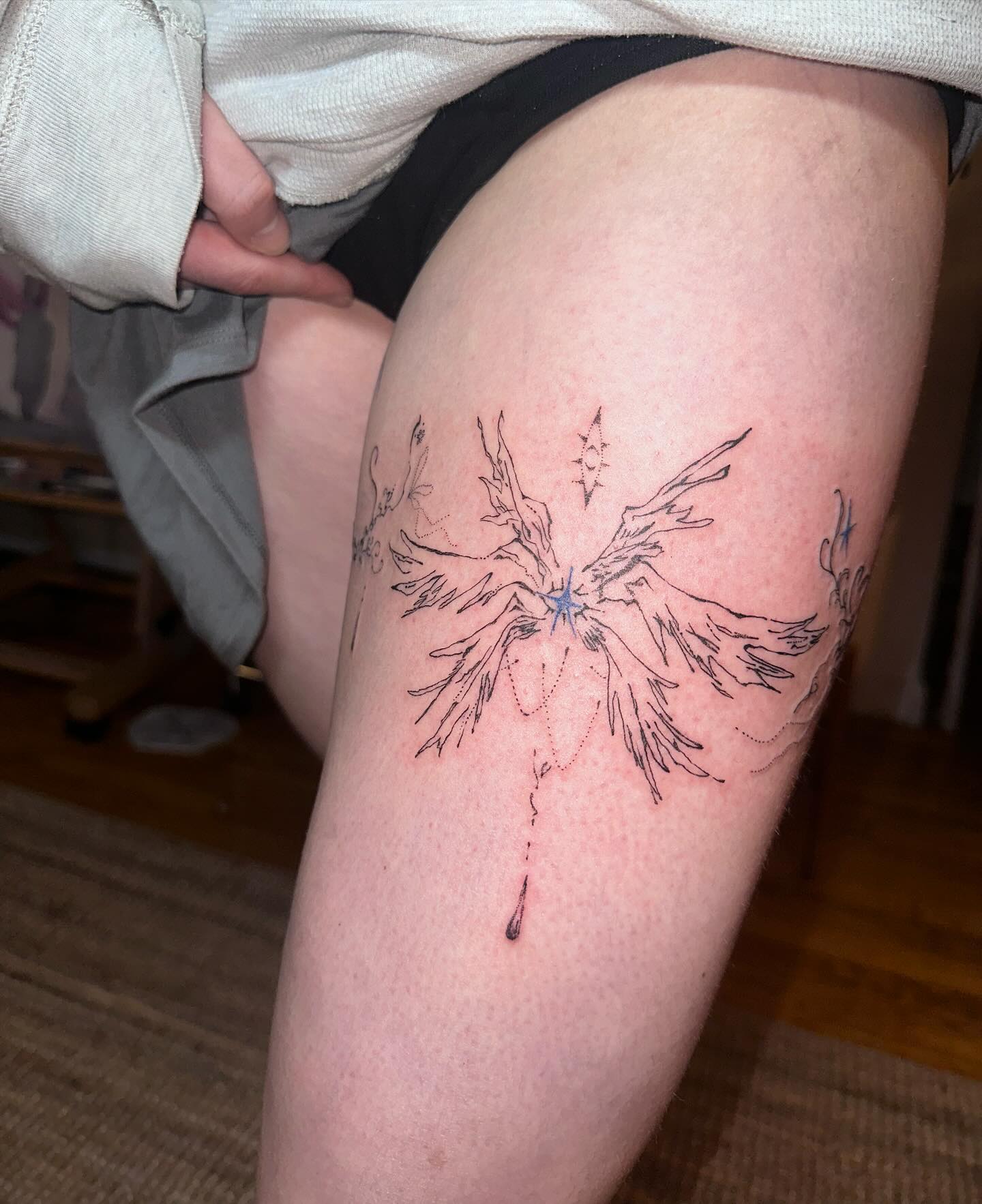 This tattoo features a stunning fantasy character with elegant details that draw the eye. The intricate design, complete with flowing hair and elaborate clothing, showcases the artist’s talent and creativity. For those considering thigh tattoos, choosing a design that reflects personal interests can make the piece even more special.