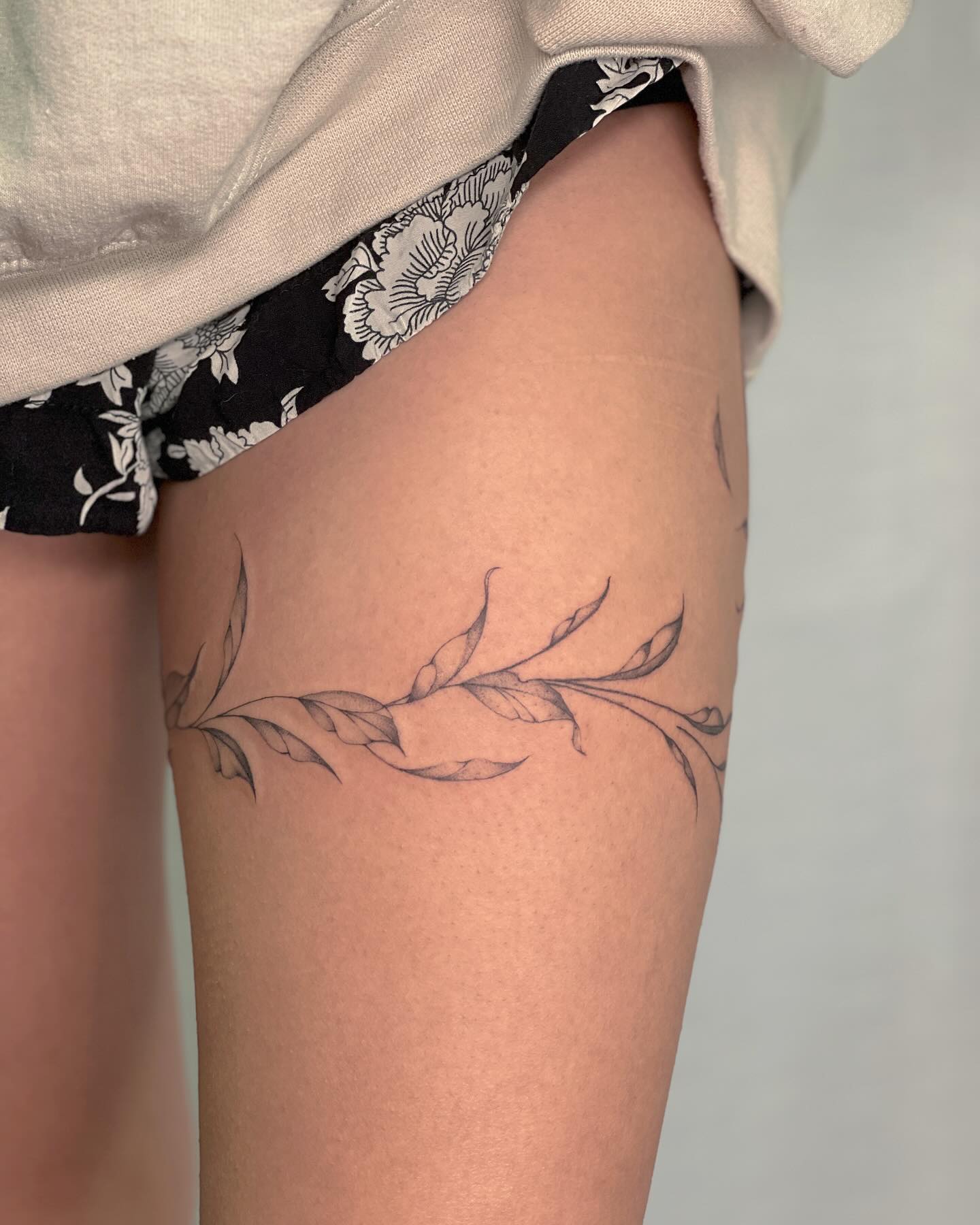 This enchanting tattoo features delicate leaves that gracefully wrap around the thigh, creating a beautiful and natural look. The intricate design adds a touch of elegance and showcases the wearer s unique style. For those considering a thigh tattoo, choosing a design that resonates personally can make it even more special.