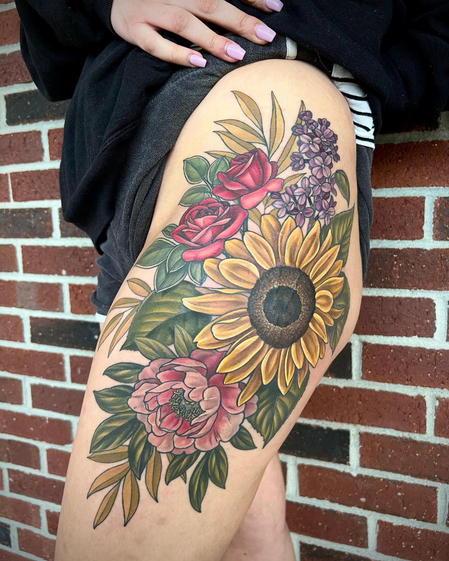 This stunning tattoo features a vibrant mix of flowers, including sunflowers and roses, creating an eye-catching design. The blend of colors and intricate details makes it a standout piece that celebrates nature’s beauty. For those considering thigh tattoos, floral themes can be a delightful way to express personal style and connect with nature.