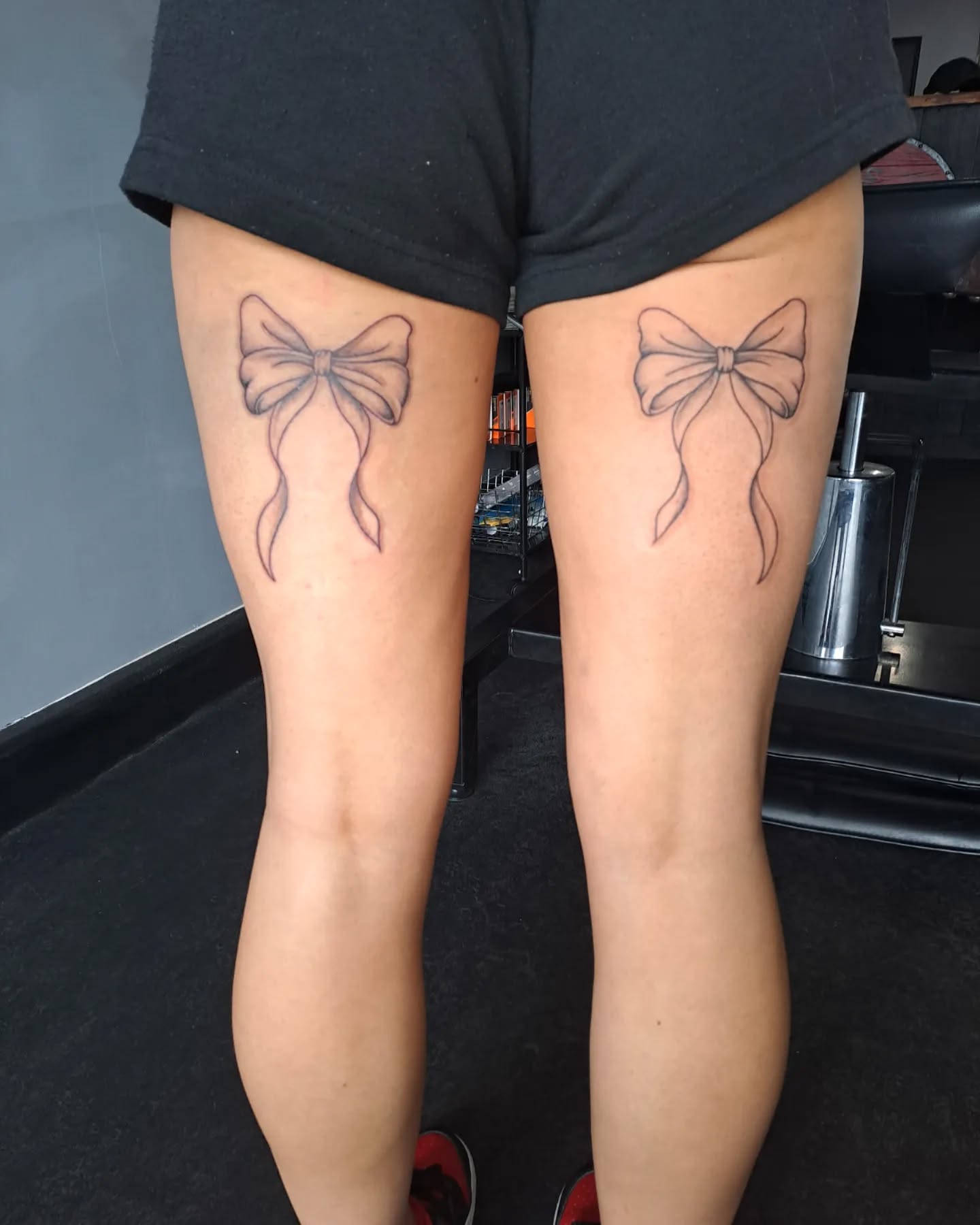 This image features a delightful pair of bow tattoos, gracefully inked on each thigh. The soft lines and gentle shading create a playful yet elegant look, making a bold statement about femininity. Choosing a design that resonates with personal style can make any tattoo feel extra special.