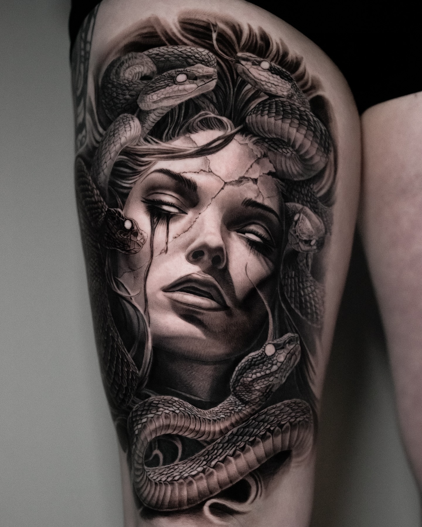 This striking tattoo features a mesmerizing design of a woman intertwined with serpents, creating a powerful visual narrative. The detailed artistry captures both beauty and strength, showcasing how tattoos can tell unique stories on the skin. For those considering thigh tattoos, choosing a design that resonates personally can make the experience even more meaningful.