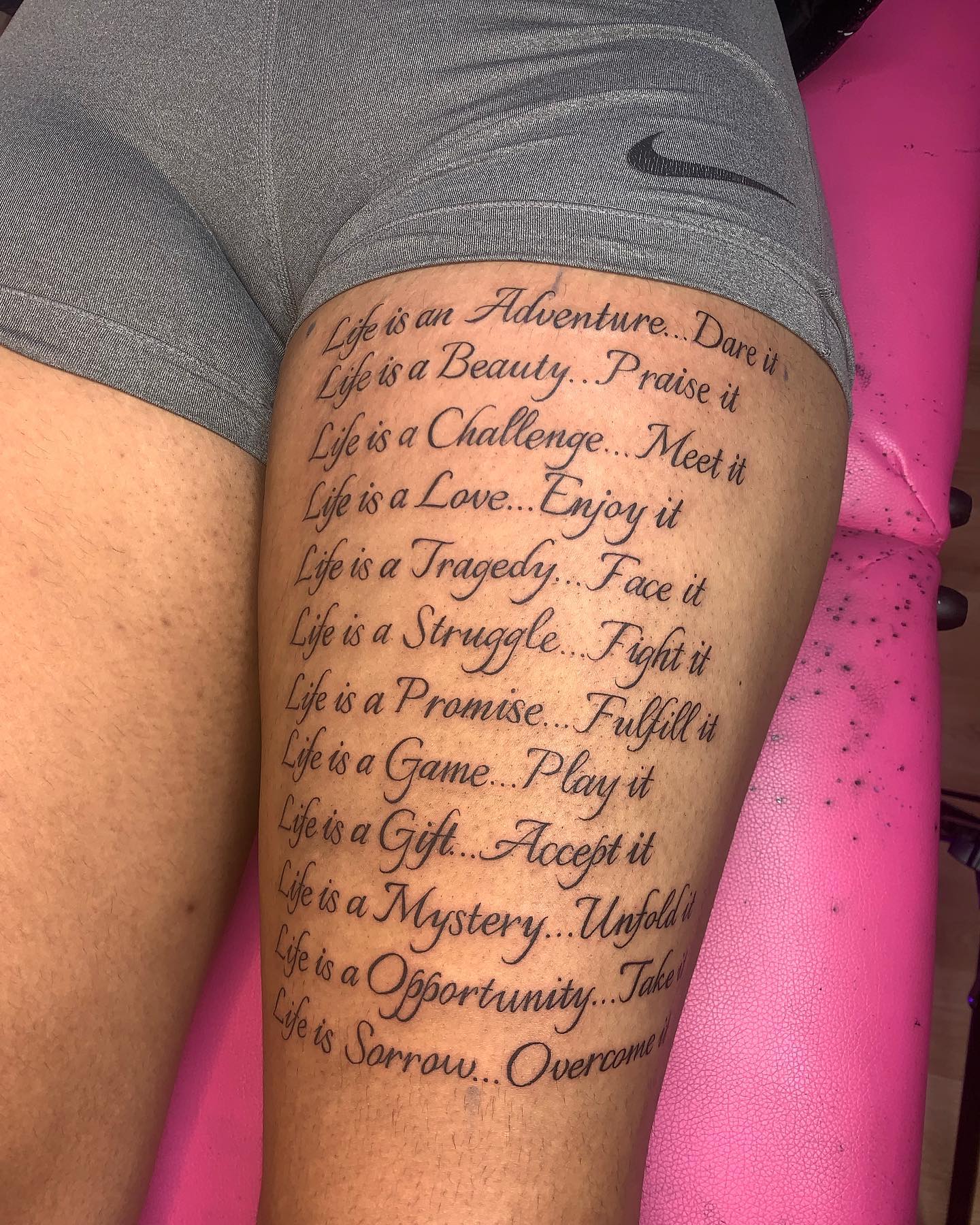 This tattoo beautifully captures inspiring life lessons in elegant script. Each phrase, from “Life is an Adventure” to “Life is Sorrow,” encourages a positive outlook and personal growth. For those considering thigh tattoos, choosing meaningful quotes can turn your skin into a canvas of motivation.