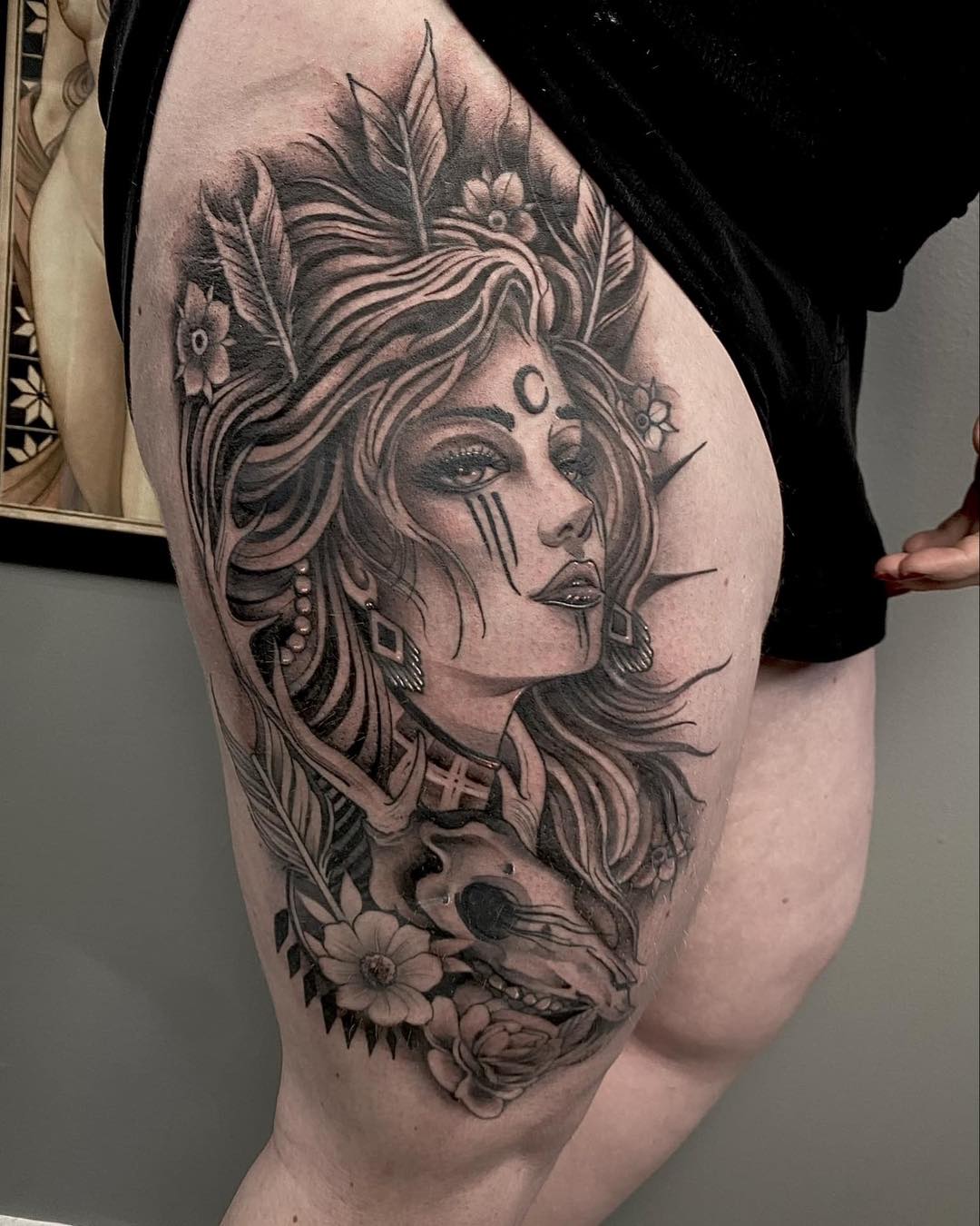 This stunning tattoo showcases a beautiful woman surrounded by intricate details, blending nature and mystique. The skillful use of shading and the delicate flowers add a unique touch, making it a true work of art. For those considering thigh tattoos, choosing a design that resonates with personal meaning can make the piece even more special.