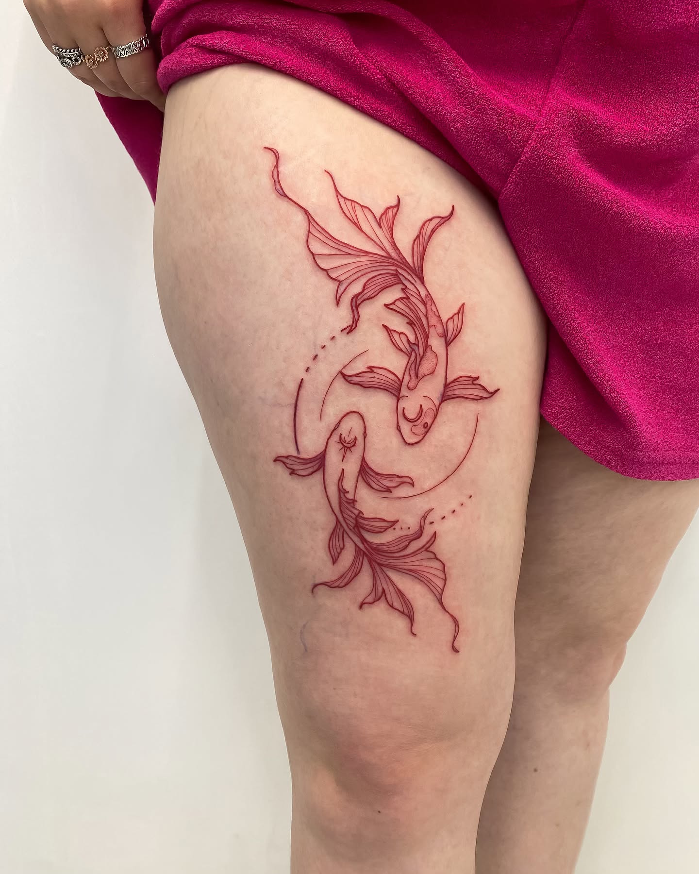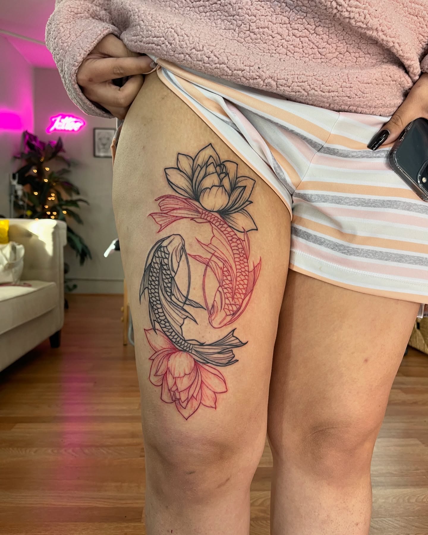 This tattoo features two beautifully designed koi fish swirling gracefully around each other, creating a sense of movement and harmony. The delicate red lines add a charming touch, symbolizing strength and perseverance in Japanese culture. For anyone considering a thigh tattoo, choosing a design with personal meaning can make it even more special.