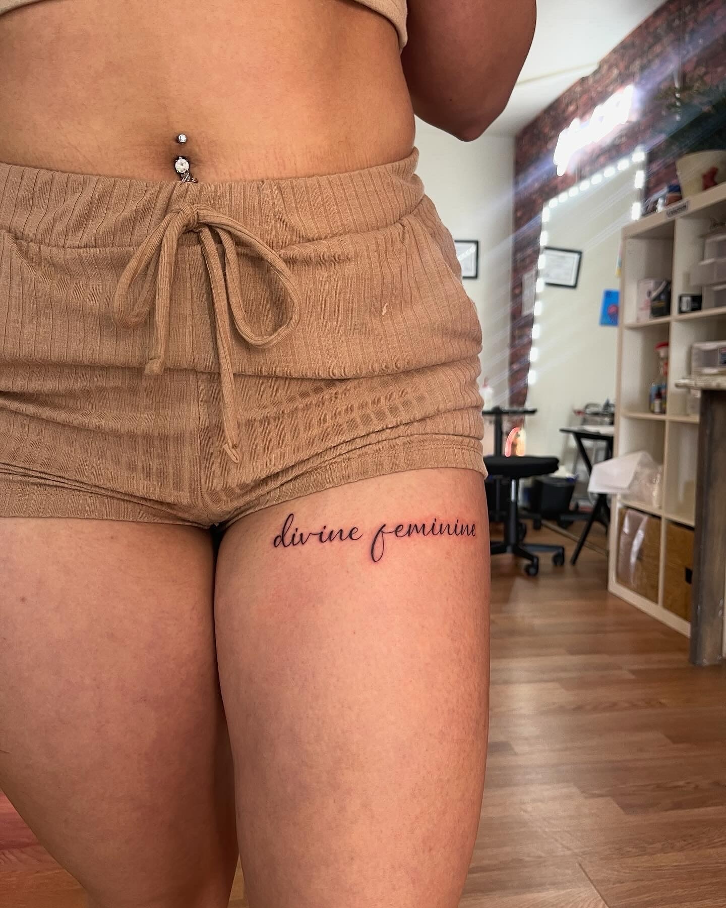 This image showcases a beautifully inked tattoo that reads “divine feminine” on a woman’s thigh, celebrating the essence of womanhood. The elegant script contrasts perfectly against her skin, making it a striking piece of body art that carries deep personal meaning. For those considering similar tattoos, choosing words that resonate personally can create a lasting connection to the artwork.