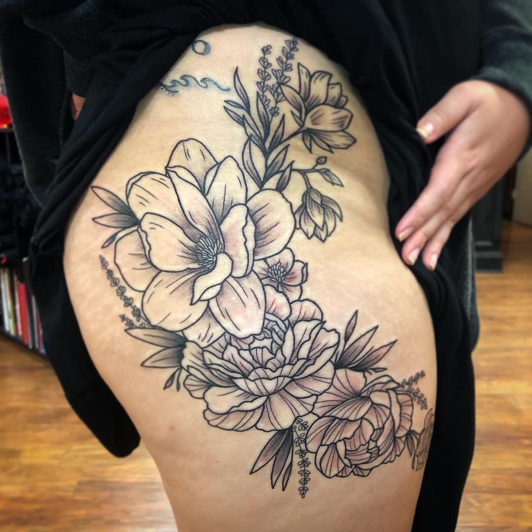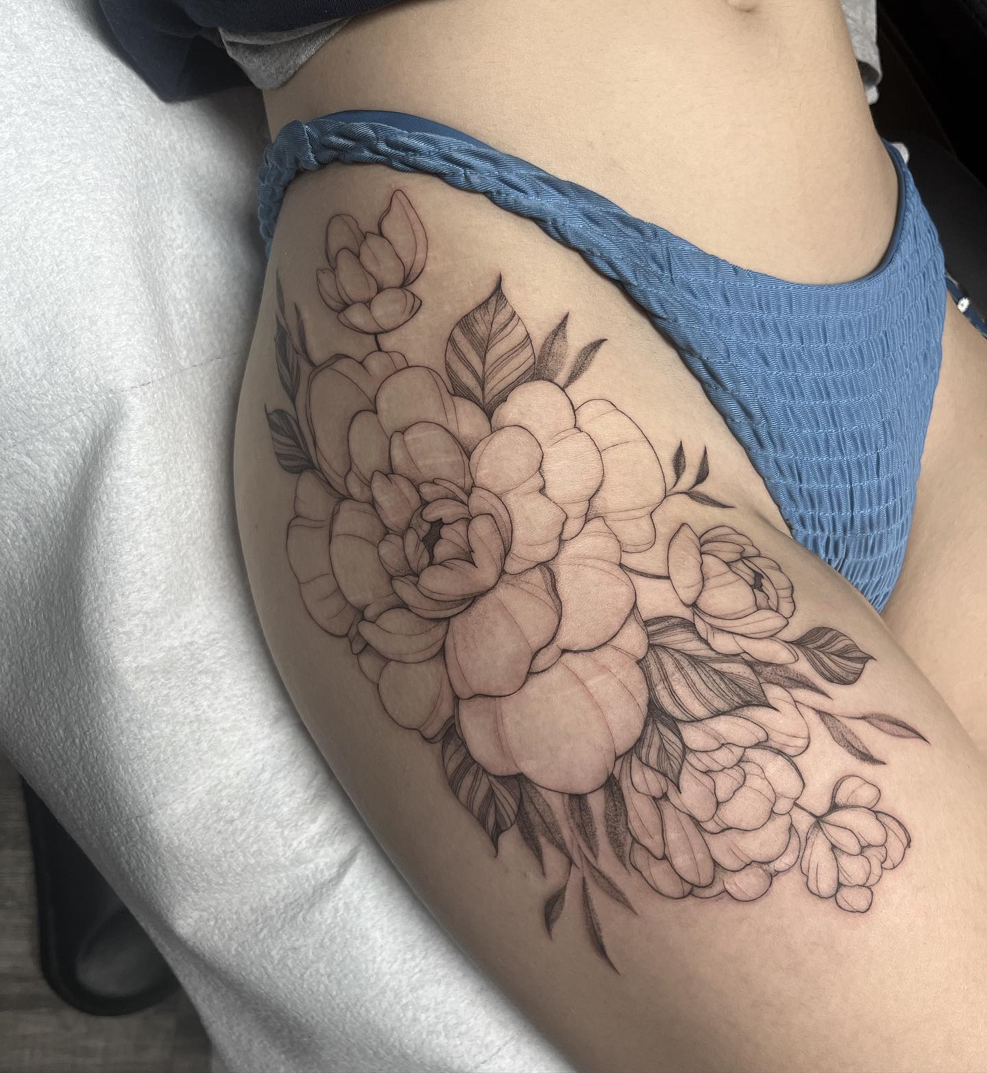 This stunning tattoo features a beautiful arrangement of blooming flowers that gracefully adorns the thigh. Each petal is delicately detailed, showcasing the artist’s skill and creativity. For those considering a thigh tattoo, choosing a design that reflects personal style can make it even more special.