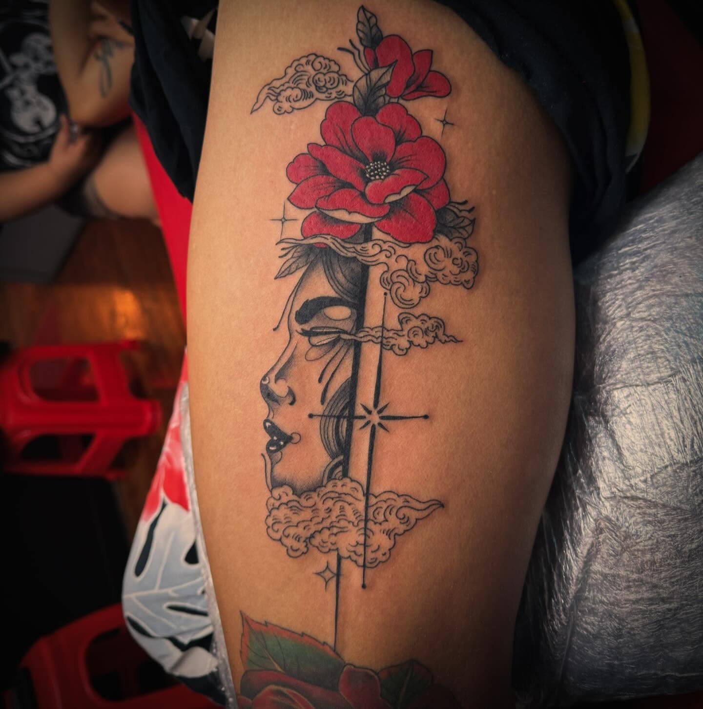 This stunning tattoo features a beautiful woman s face adorned with a vibrant red flower, surrounded by delicate clouds. The intricate details and striking colors create a mesmerizing visual that draws the eye and tells a unique story. When choosing a thigh tattoo, consider how the design reflects personal significance or style, making it truly special.