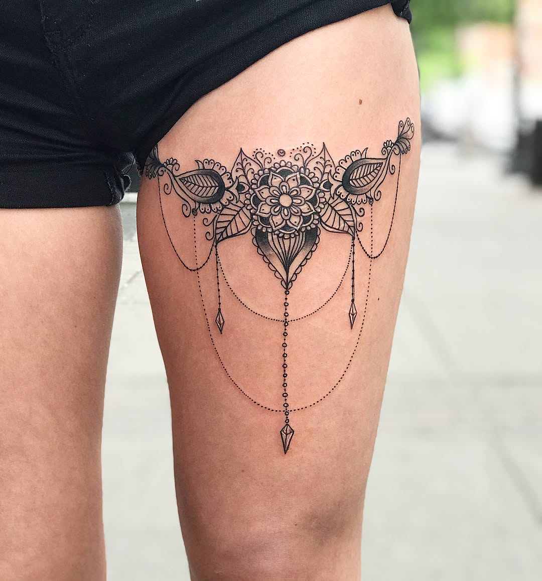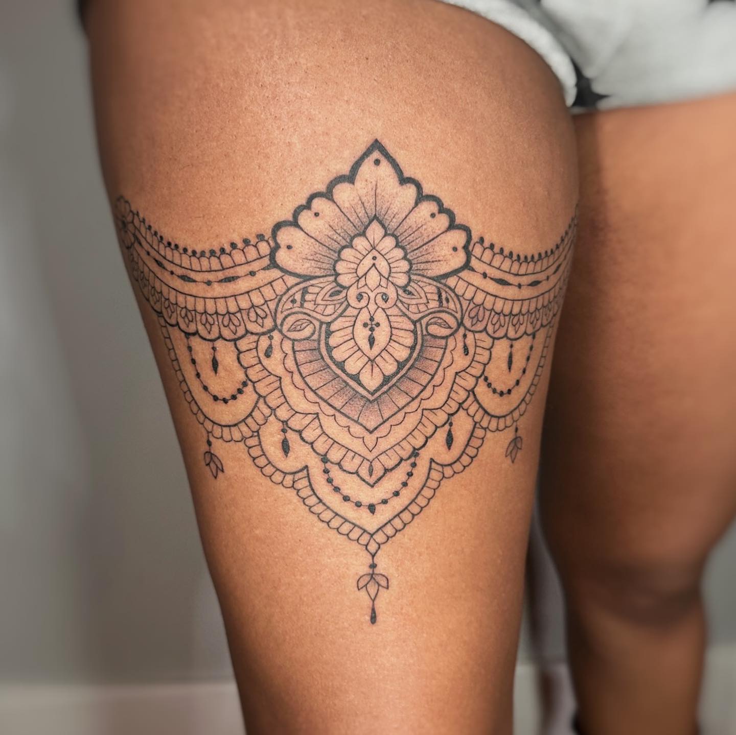 This stunning tattoo features a beautiful floral lace pattern that gracefully adorns the thigh. Its intricate details and elegant shapes create a captivating visual that draws the eye. For those considering thigh tattoos, opting for a design that reflects personal style can make the art feel even more special.