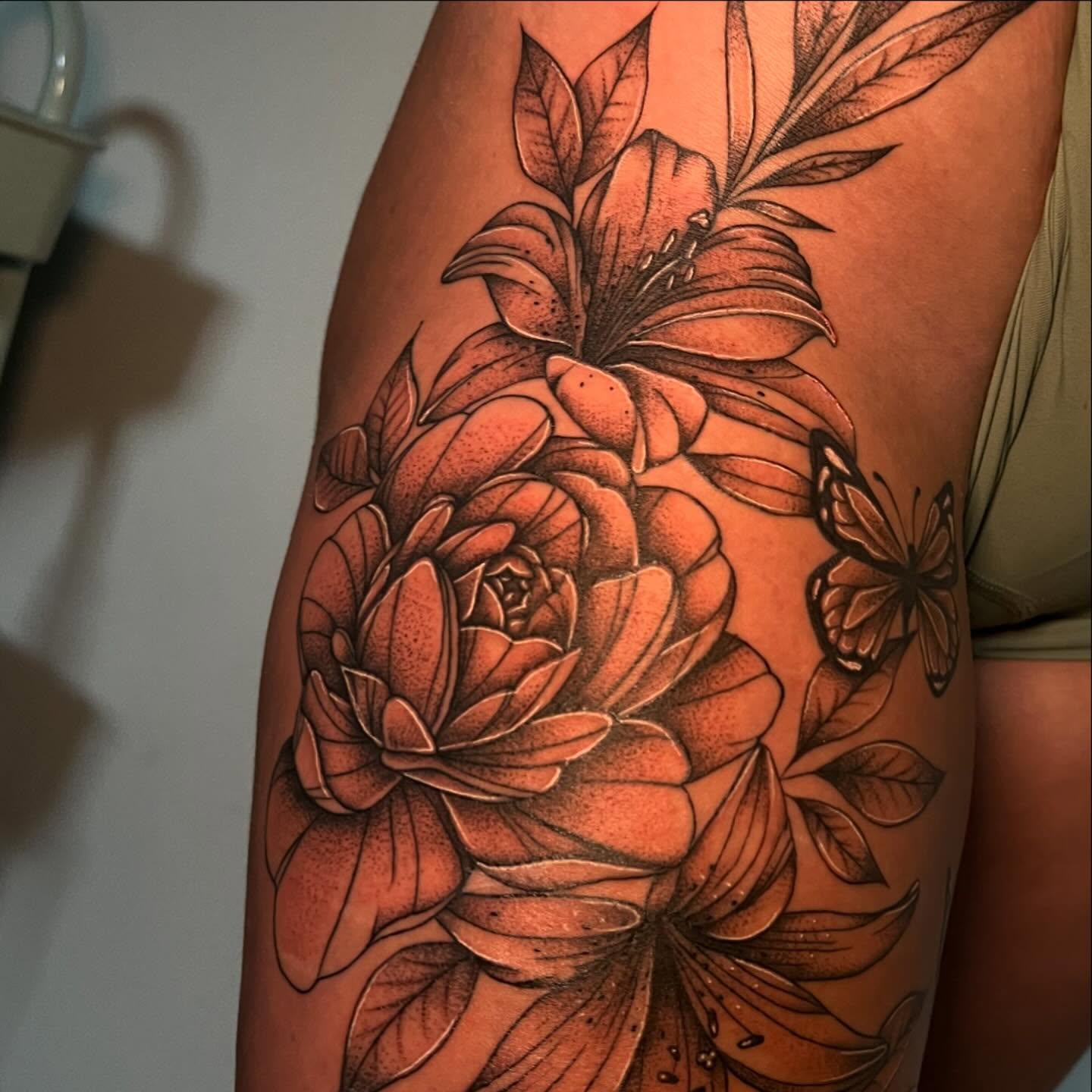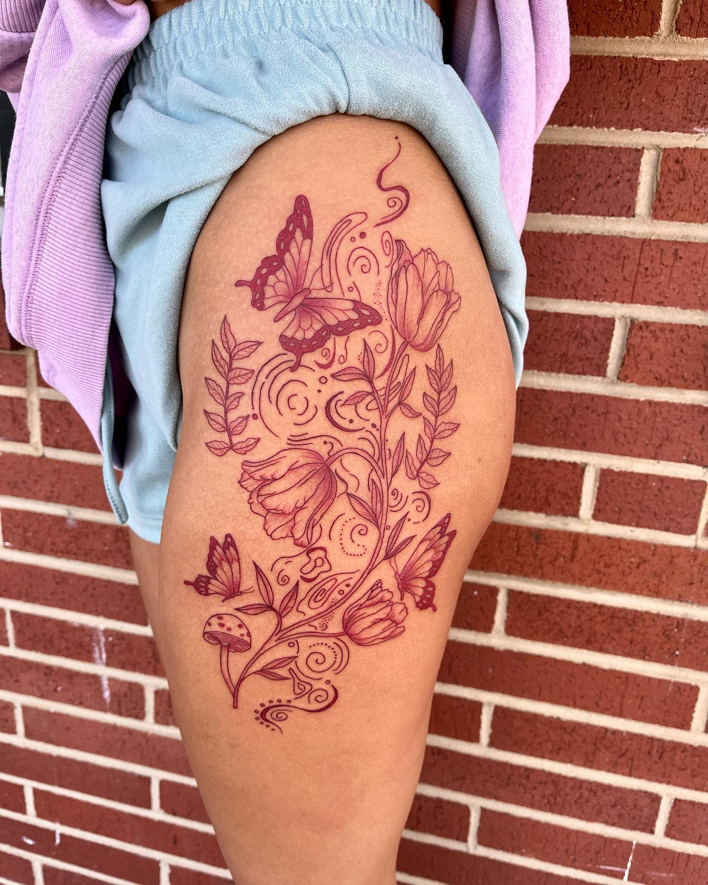 This image showcases a beautiful thigh tattoo featuring delicate flowers and butterflies, creating a sense of whimsy and grace. The soft, intricate design flows naturally, making it a striking piece of art on the skin. Choosing a tattoo that reflects personal meaning can make it even more special and memorable.