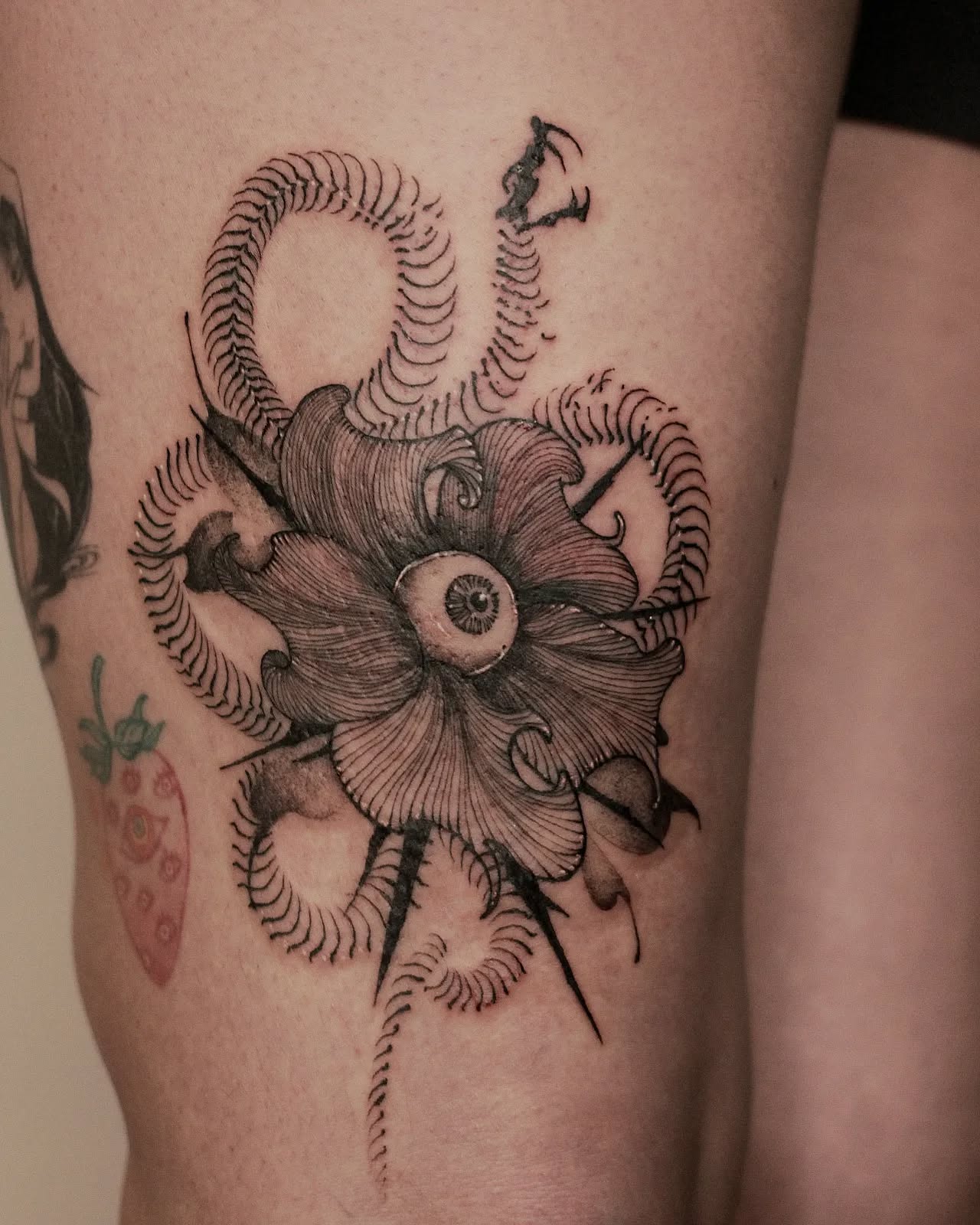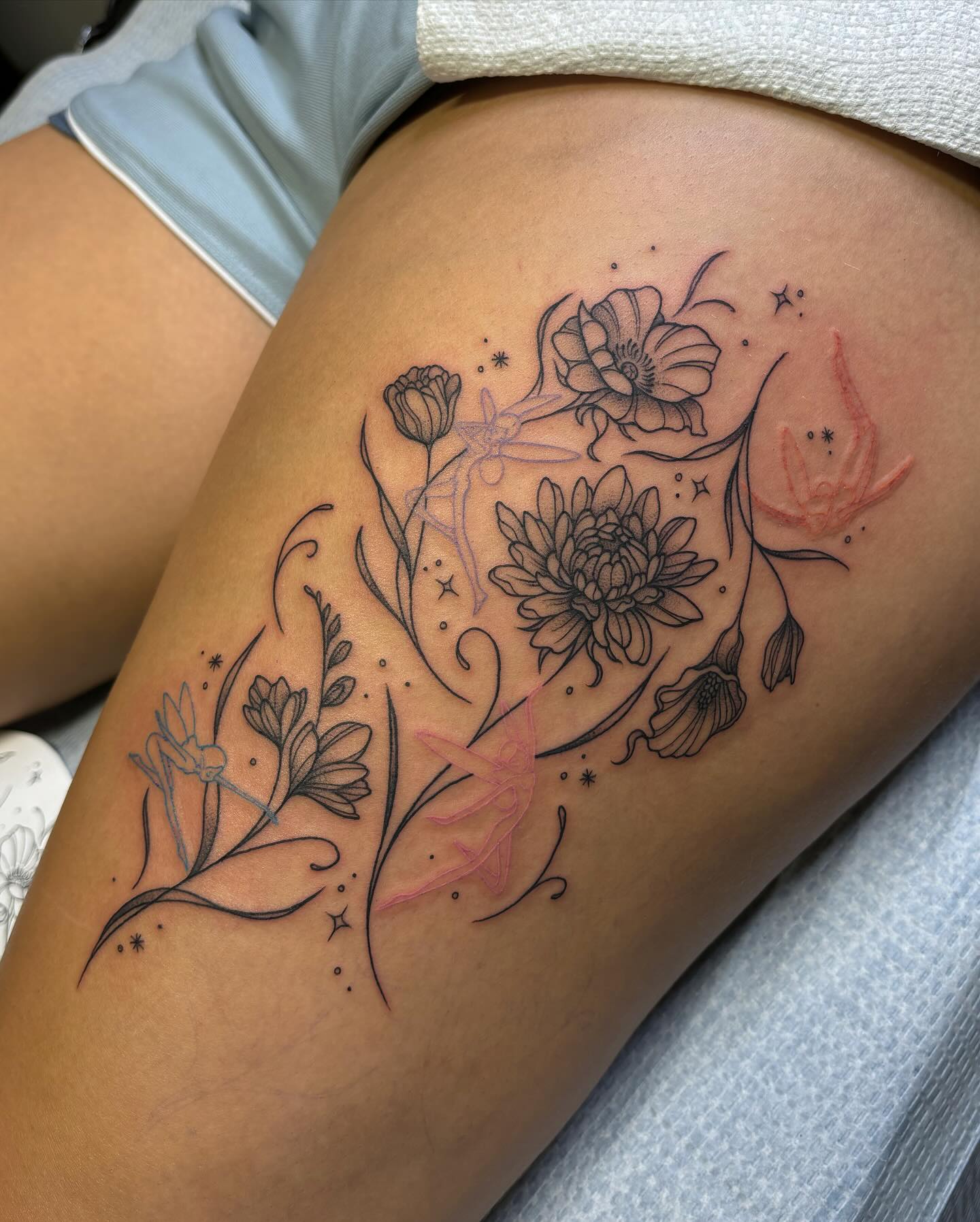This stunning tattoo features a delicate arrangement of flowers and whimsical details that dance across the thigh. The blend of intricate line work with soft colors creates a charming look that feels both modern and timeless. For anyone considering a thigh tattoo, choosing a design that reflects personal interests can make it even more special.