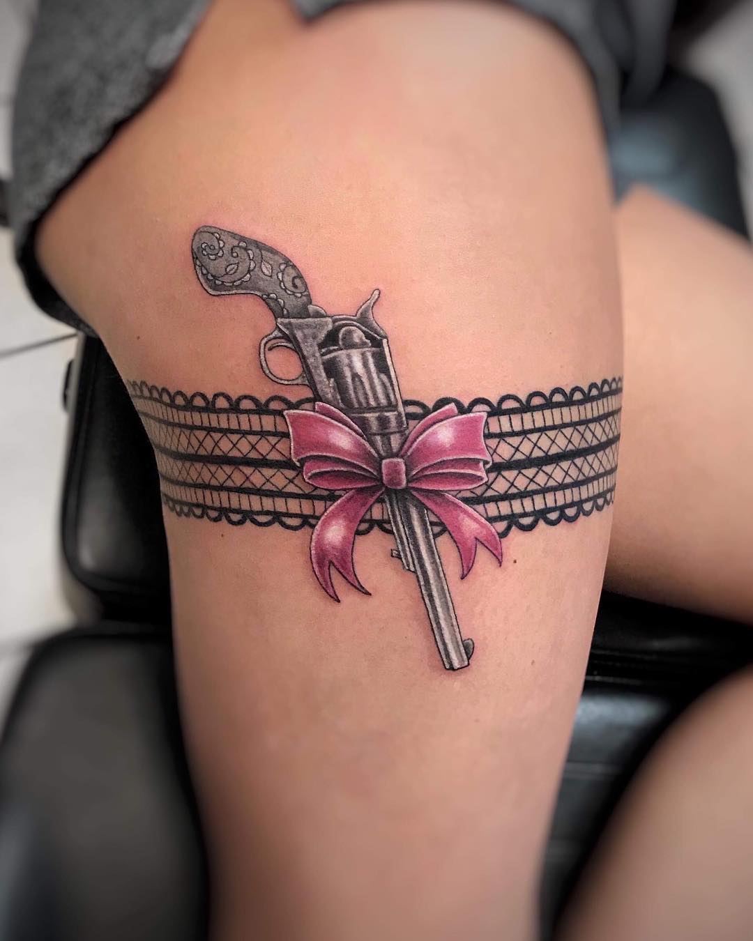 This striking thigh tattoo combines elegance and edge with a beautifully detailed revolver wrapped in a charming pink bow. It tells a unique story of strength and femininity, showcasing how tattoos can blend contrasting themes. For those considering thigh tattoos, it’s a great reminder that personal style can be both bold and graceful.