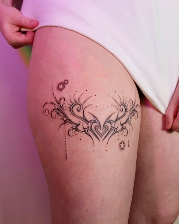 This stunning thigh tattoo features a beautiful heart surrounded by intricate swirls and stars, showcasing a blend of elegance and artistry. The delicate details create a sense of movement, making it a memorable piece. Choosing a design that resonates personally can make a tattoo feel even more special and meaningful.