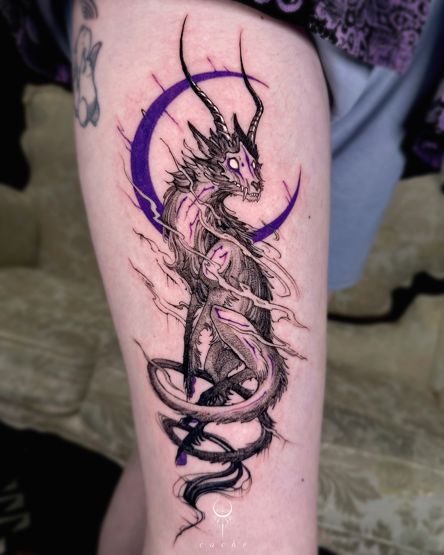This thigh tattoo features a stunning mythical creature, beautifully entwined with elegant swirls and a striking purple moon in the background. The intricate details bring the artwork to life, showcasing the artist’s skill and creativity. For those considering a similar design, choosing a meaningful symbol can add a personal touch to the tattoo.