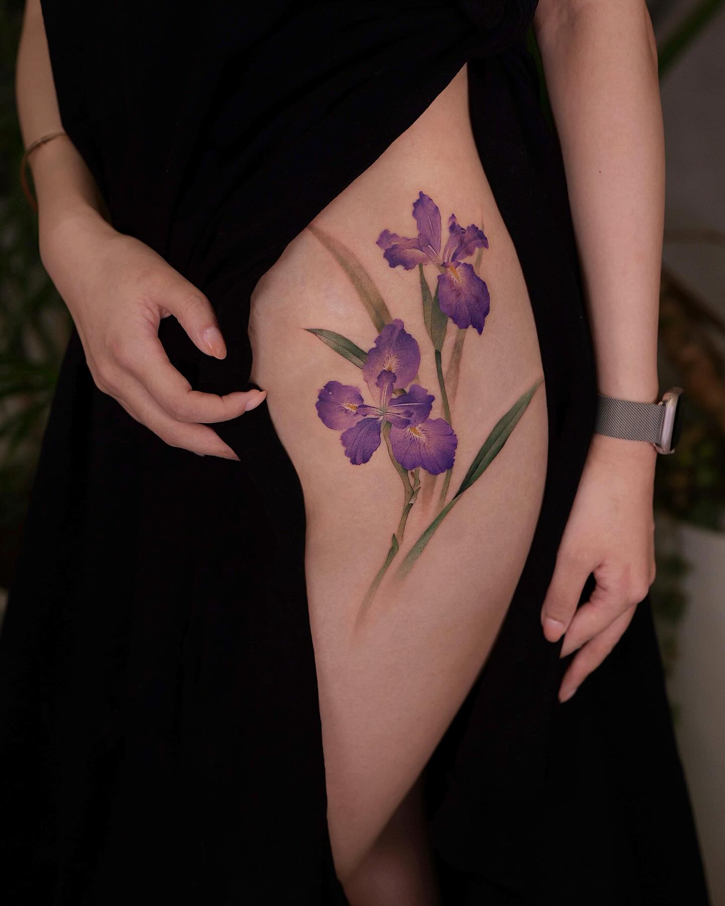 This beautiful tattoo features stunning purple irises that seem to bloom right on the skin. The vibrant colors and intricate details create a captivating look that draws the eye and celebrates nature’s beauty. For those considering thigh tattoos, floral designs can be a lovely way to express personality and style.