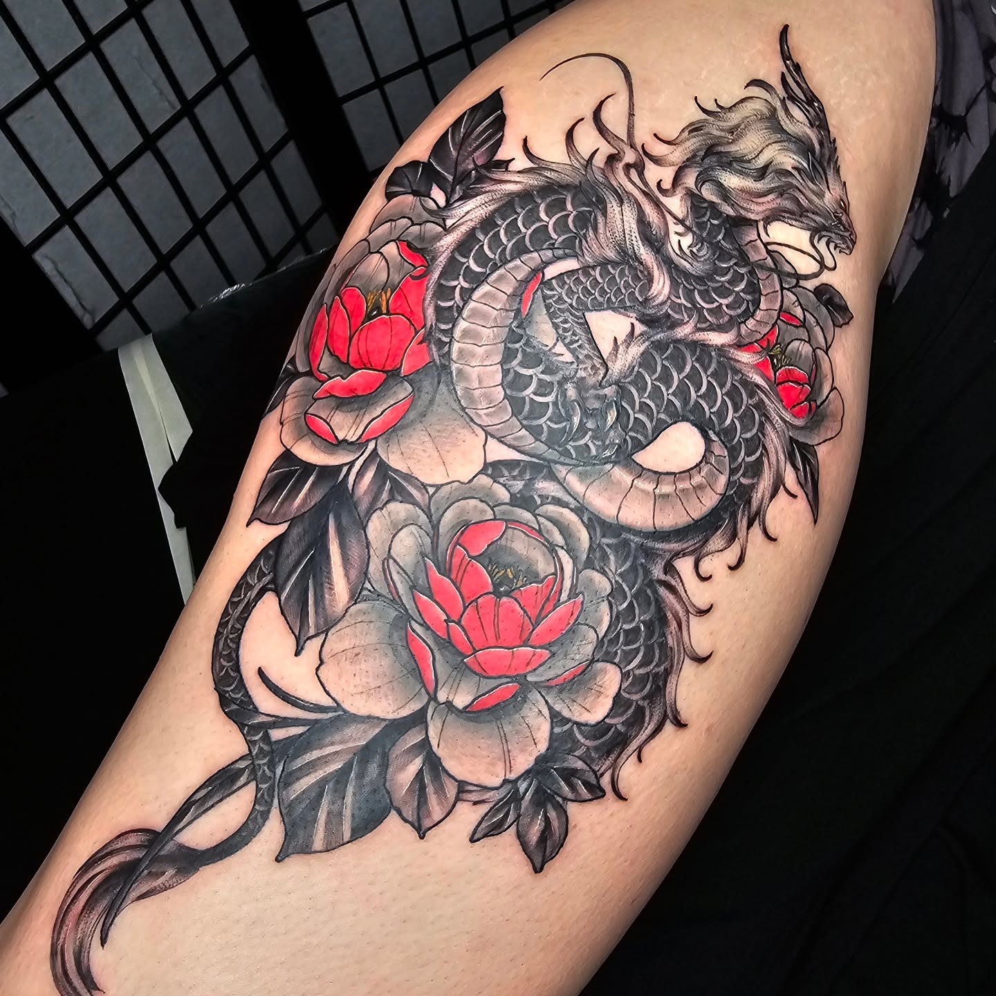 This thigh tattoo features a stunning dragon entwined with vibrant red flowers, creating a beautiful blend of strength and femininity. The intricate details of the dragon’s scales and the delicate petals of the blooms tell a story of balance between power and grace. For those considering similar designs, choosing elements that reflect personal significance can make the artwork even more special.