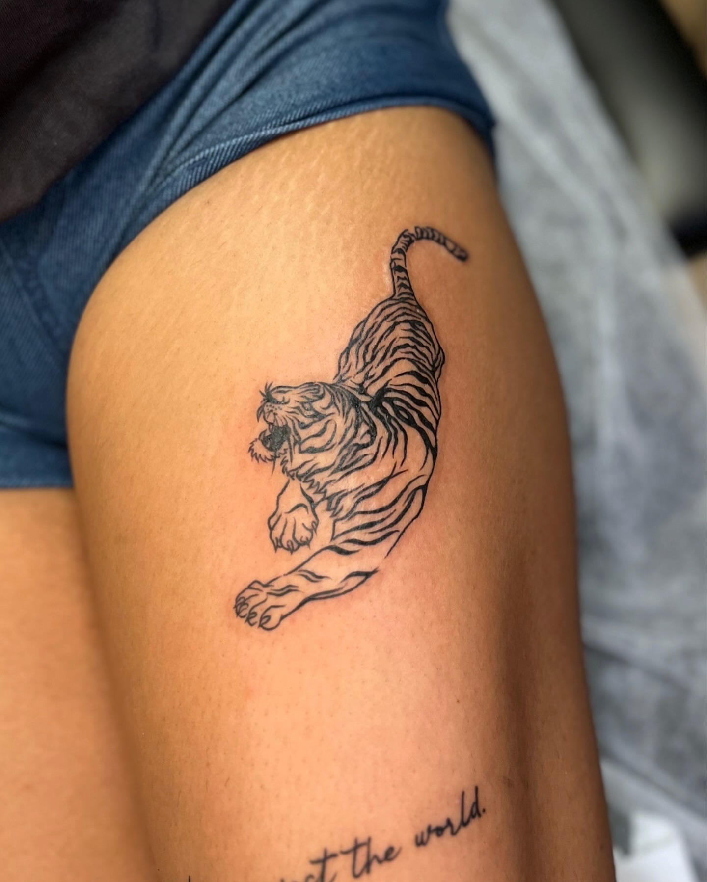 This stunning tattoo of a leaping tiger showcases both strength and grace, beautifully inked on a woman’s thigh. The detailed lines and fierce expression of the tiger capture the power of nature, while also representing a spirit of freedom and courage. Choosing an animal tattoo can be a personal symbol of one’s inner strength, making it a unique choice for self-expression.