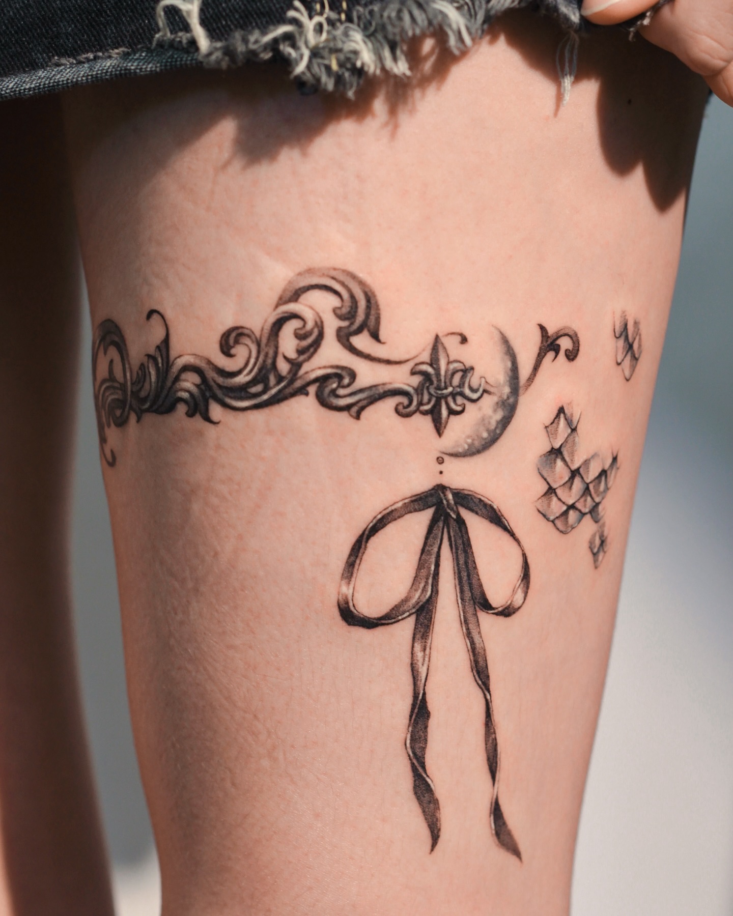 This tattoo beautifully combines swirling patterns with a delicate ribbon and crescent moon, creating an eye-catching piece on the thigh. The elegant details invite intrigue, making it a perfect representation of personal style and creativity. For those considering a thigh tattoo, choosing designs that reflect one s personality can make the art feel even more special.